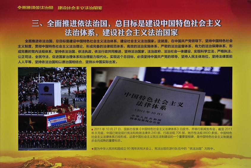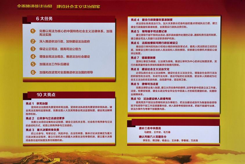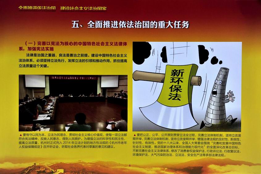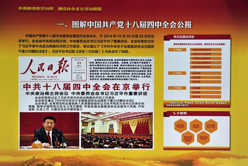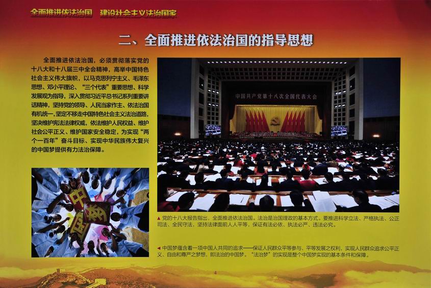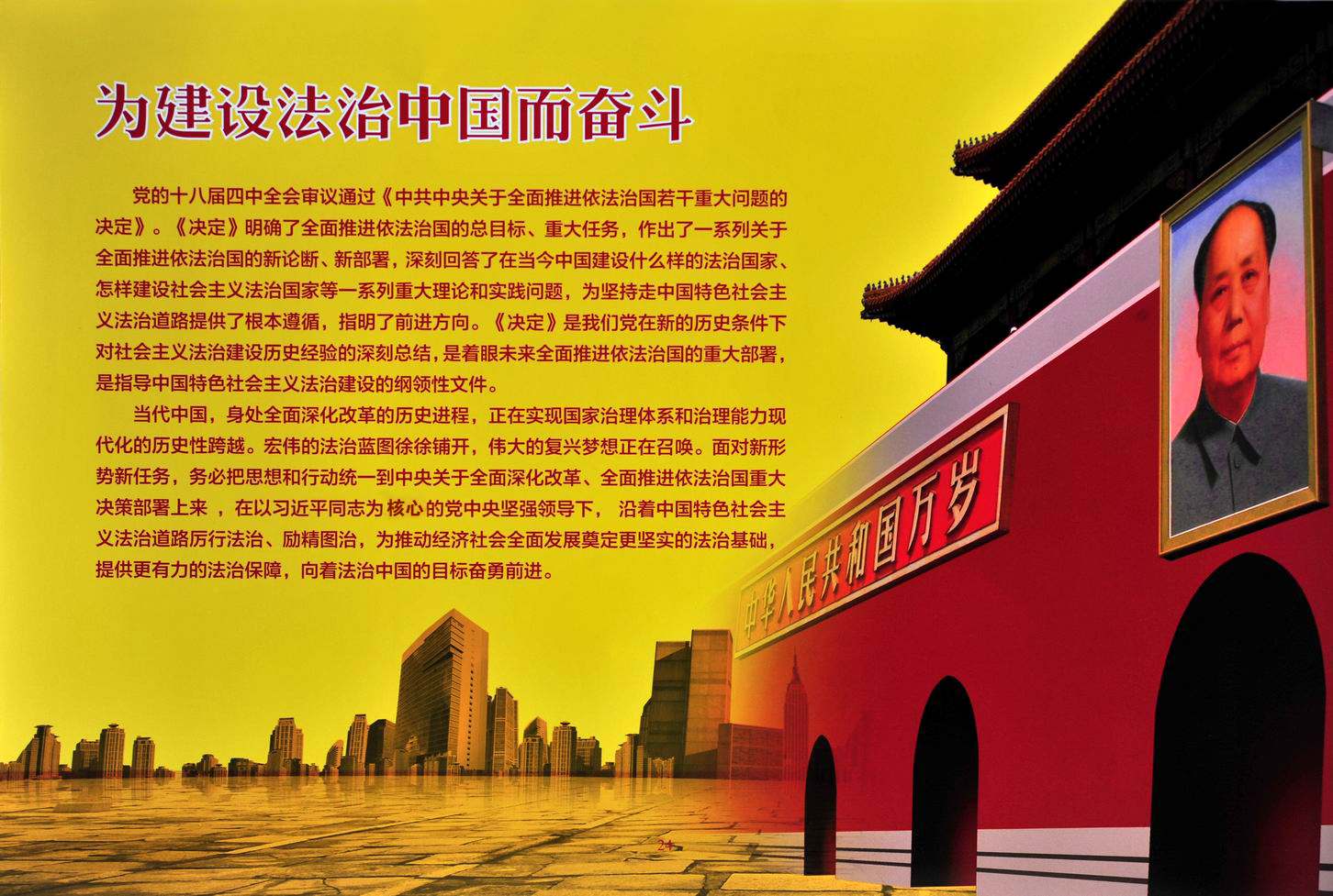 2014年10月,中国的依法治国进程又迎来一个重要时刻。党的十八届四中全会把法治中国建设提升到前所未有的高度——在新的历史起点上,会议对法治国家、法治政府、法治社会一体建设作出全面部署。依法治国事关党执政兴国、事关人民幸福安康、事关党和国家长治久安。依法治国唤起的制度力量,必将有力提升国家治理体系和治理能力现代化,为建设中国特色社会主义法治国家,实现中华民族伟大复兴中国梦提供有力保障。