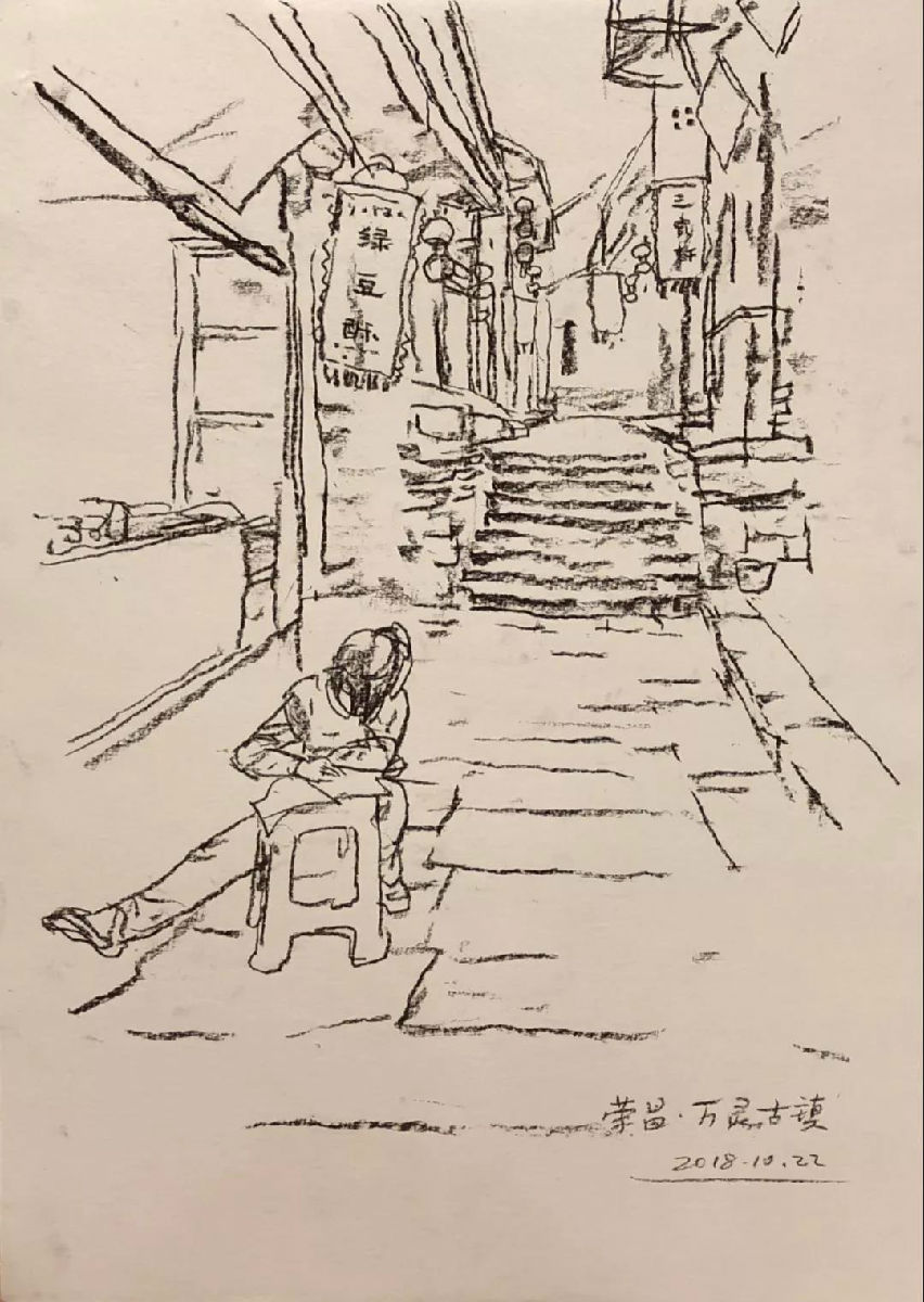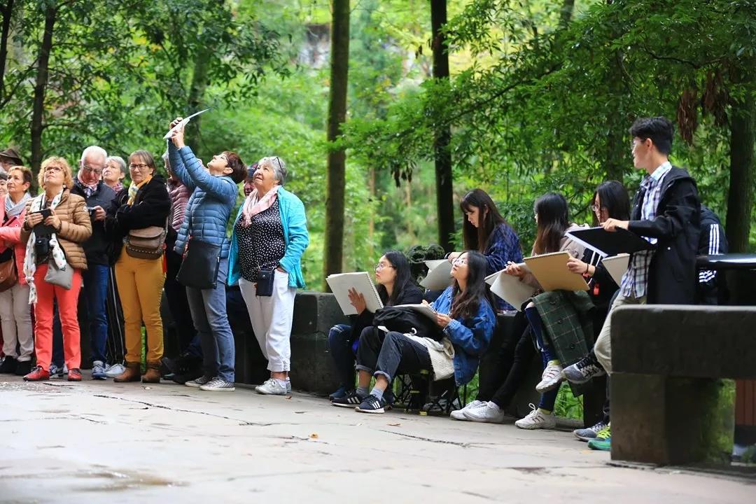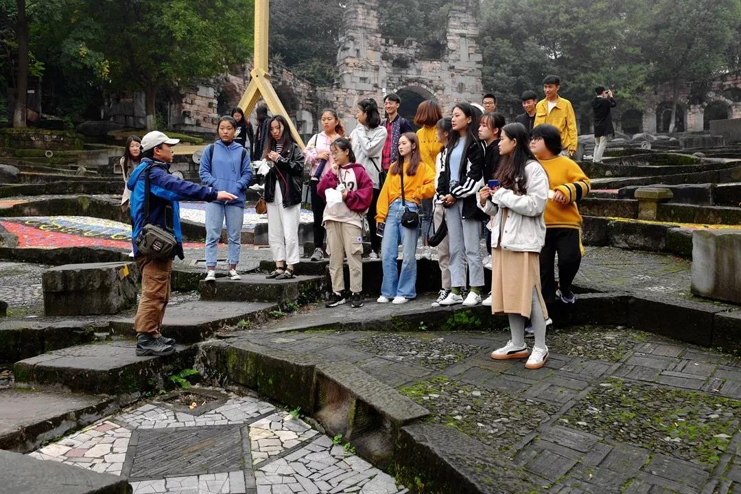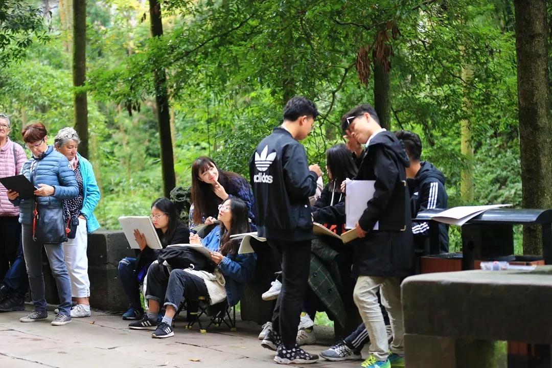被誉为世界八大石窟之一的重庆大足石刻,也是这次采风最为重要的一站。这里的石刻其规模宏大、雕刻精美、题材多样、内涵丰富和保存完整而著称于世。同学们在现场除拍照记录外,拿出炭笔和速写本,进行了写生,通过实践来检验自己的专业水平。在用眼观察,用手绘制的过程中感受传统、体验文化,从而达到更好的学习效果。
