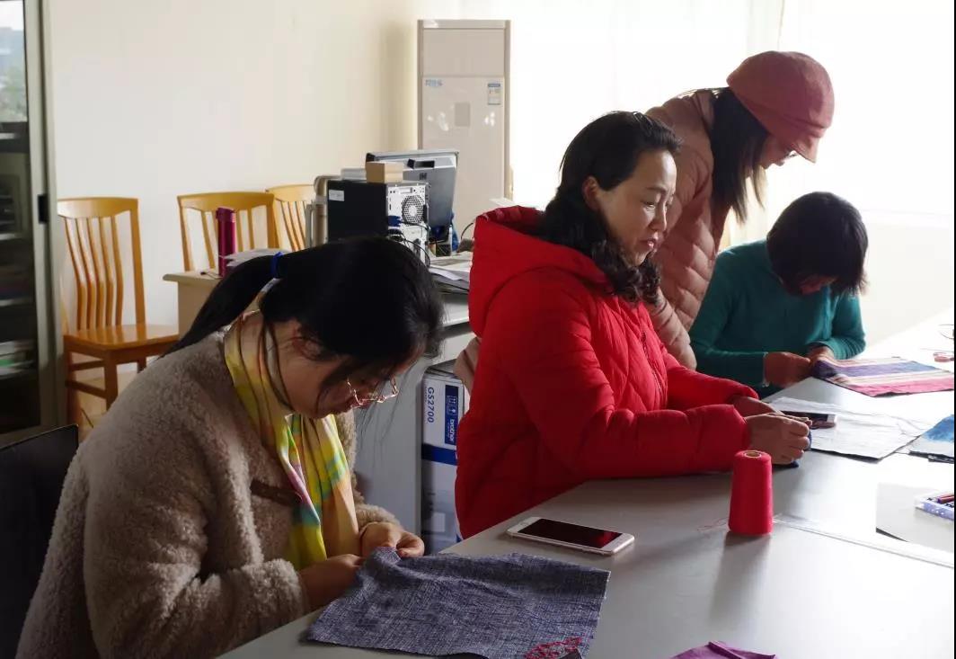 初春的午后,阳光暖暖地洒进来,更为工作室增添了一份浓浓的暖意,女党员们集聚一堂,在专业老师的指导下,开始了布包的设计及制作体验。一针一线,女性独有的柔美、灵巧在举手投足间流动了起来;短短几个小时,一件件精美小巧的布包呈现出来。精致的绣花,质朴的肌理,柔和亦或强烈的色彩对比,勾勒出每一位制作者的艺术特质。