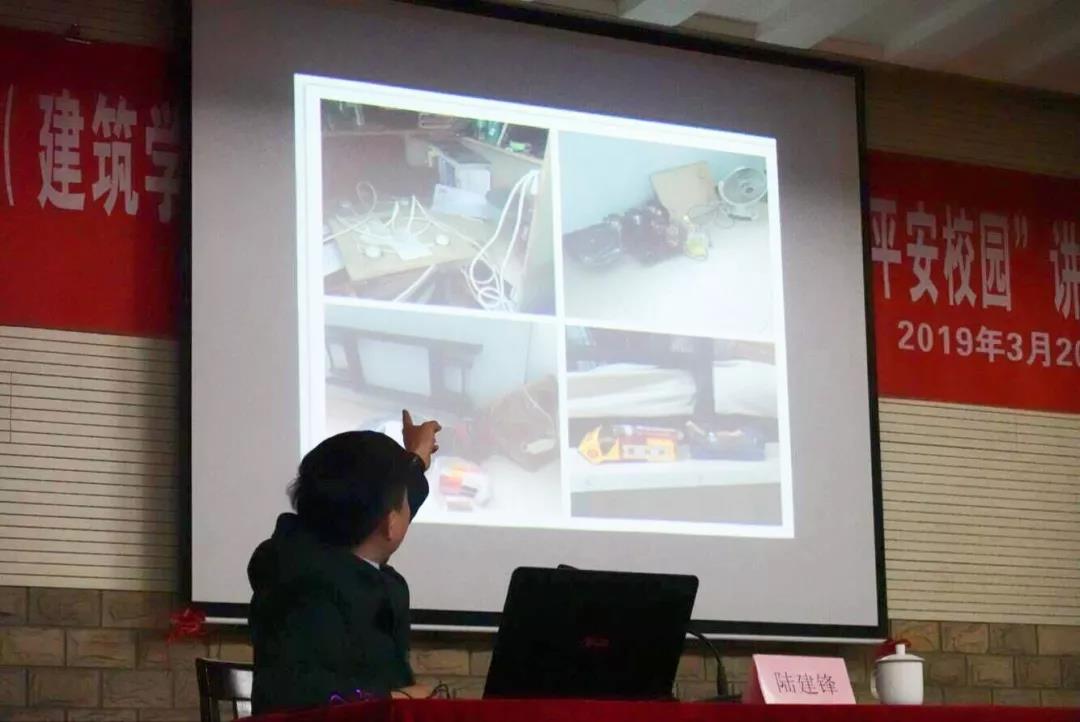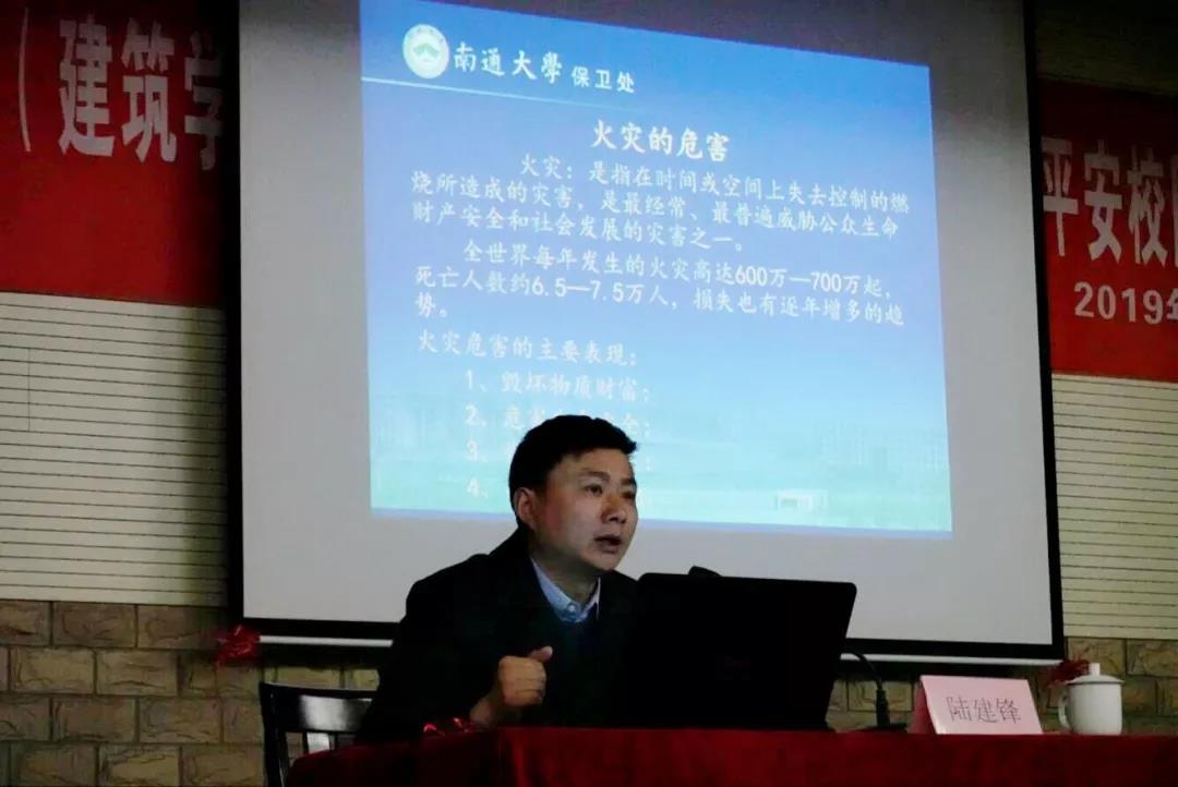 为提高学生的消防安全意识,强化学生的消防安全教育,3月20日下午,艺术学院(建筑学院)邀请保卫处治安科副科长、钟秀保卫办主任陆建锋老师在钟秀校区主报告厅举办了“敲响消防警钟,建设平安校园”专题讲座。艺术学院(建筑学院)党委书记马列波,艺术学院(建筑学院)党委副书记、副院长沈江,艺术学院(建筑学院)学工办主任张诚以及艺术学院(建筑学院)辅导员李锋出席了讲座,2018级宿舍舍长和2017级全体同学共同参加了本次讲座。