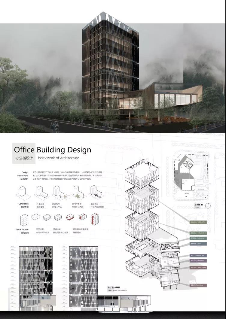 该办公楼选址于广西科技大学旁,当地气候环境炎热潮湿,为创造较为宜人的工作环境,办公楼的设计之初就旨在突破传统核心筒高层通风环境较差的缺陷,由此而产生了如下的中空构型。同时兼顾贯通空间的形成以增加办公空间的丰富性。