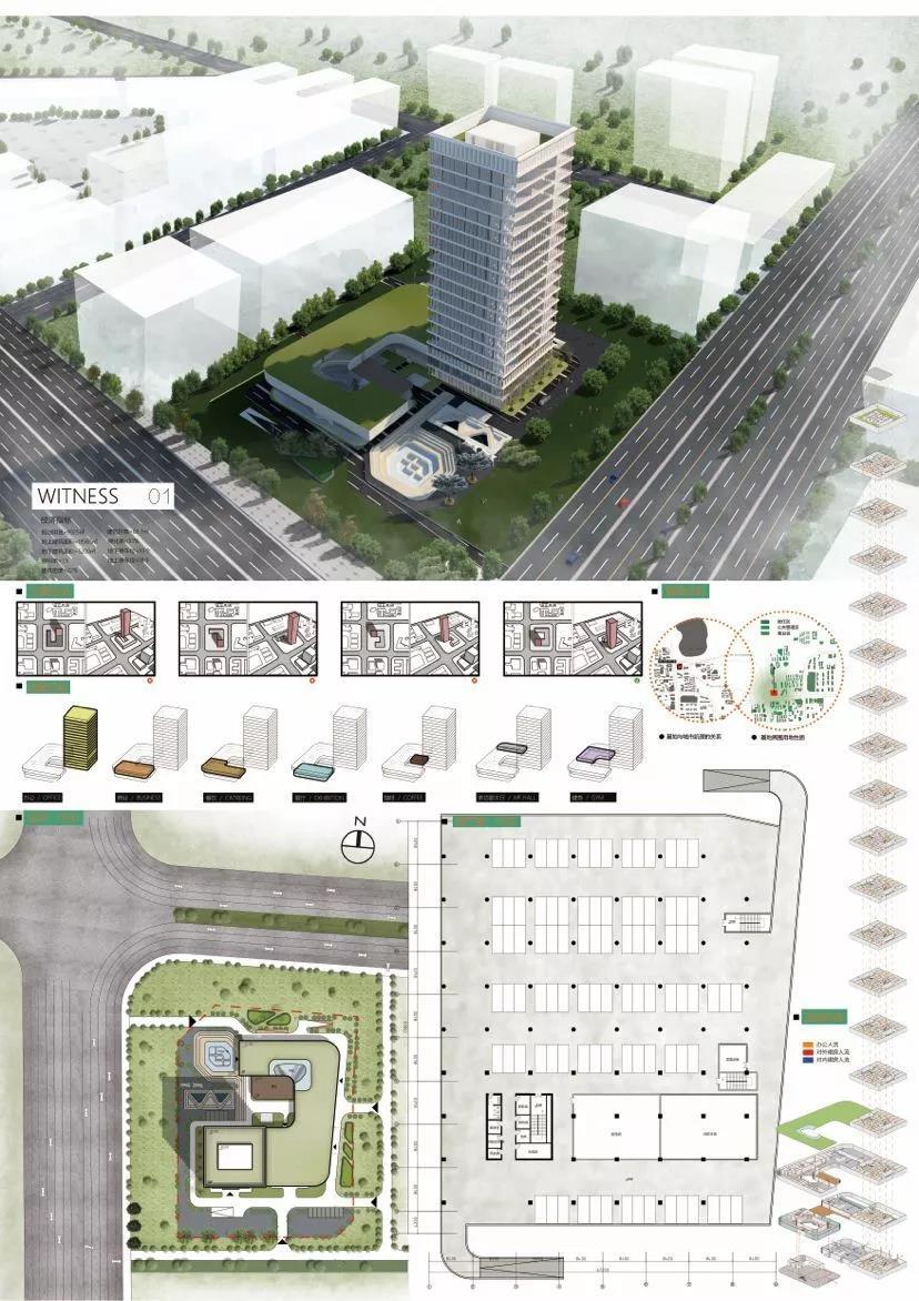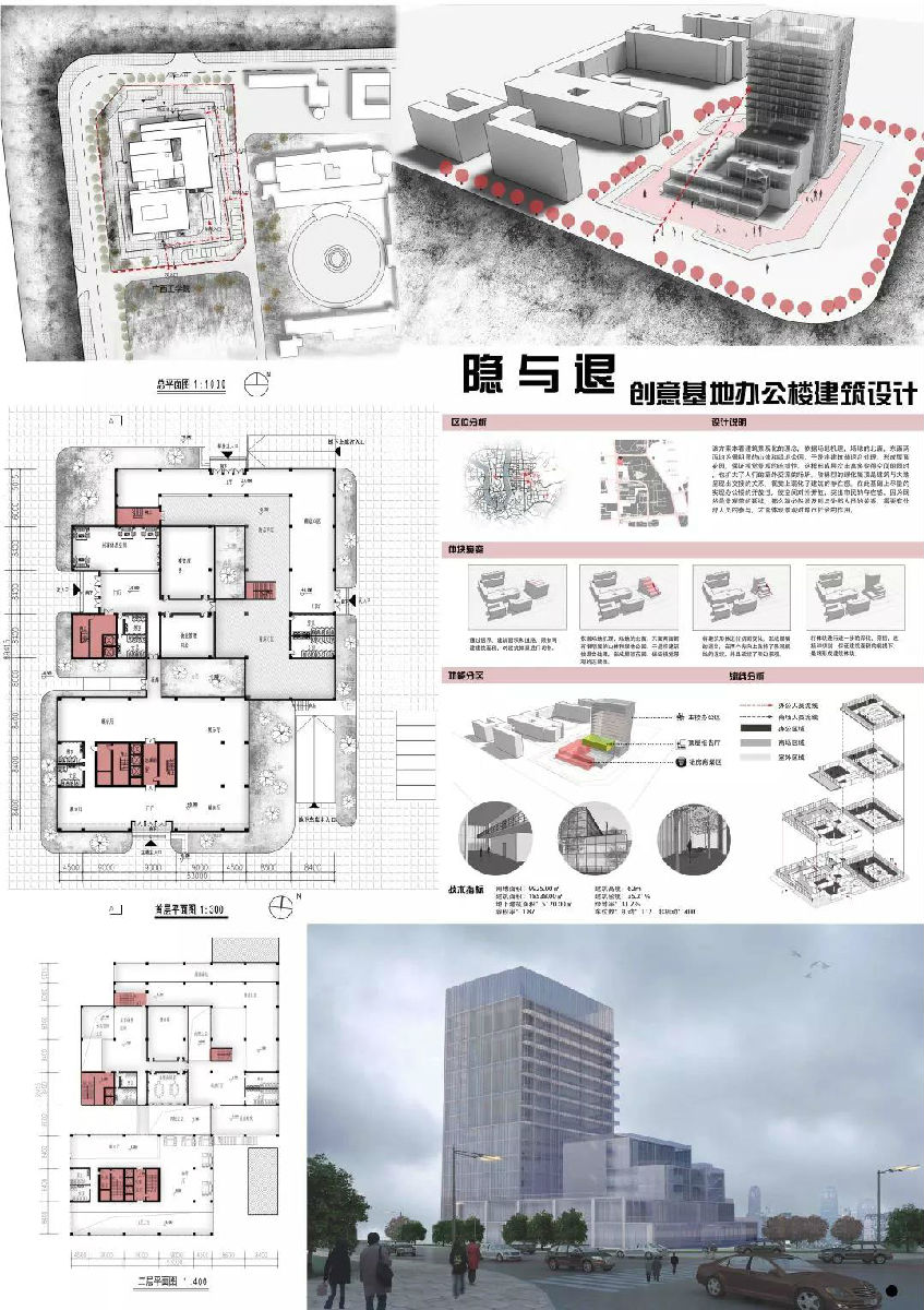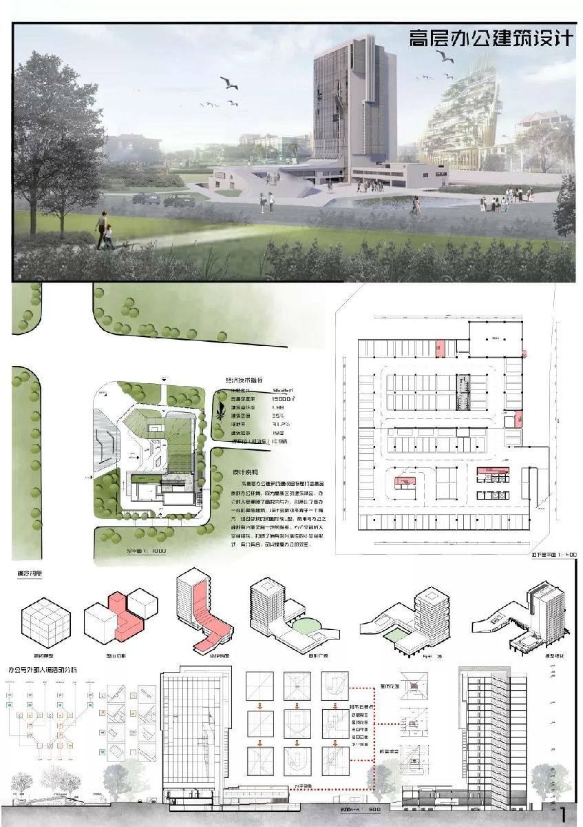 本次设计以山水为意象,将其抽象为裙房的层层退台与主楼的层层交错,并在裙房中央设置中庭,强调退台关系的同时,引入水景。