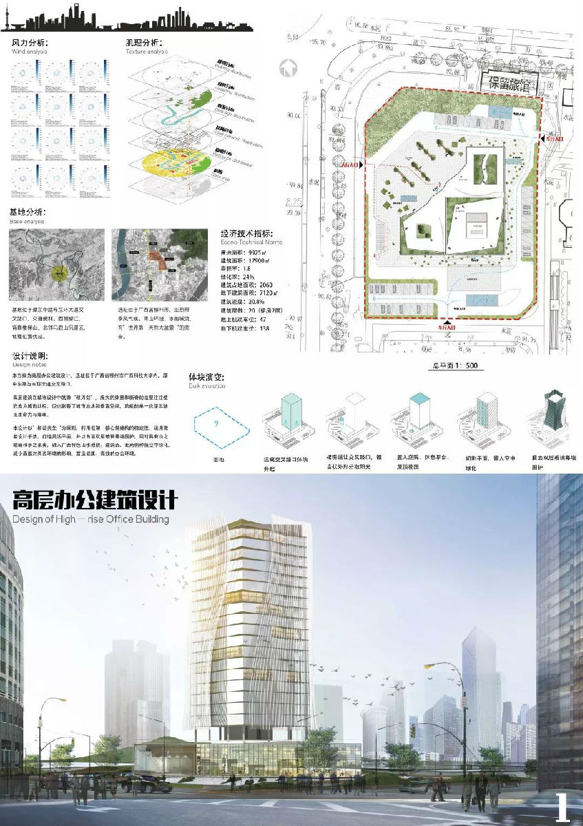 该建筑的设计理念从柳江出发,将裙房化船,将主楼化帆,从基地环境与建筑布局出发,考虑新建建筑与原有建筑的关系,重视新建高层立面与周围环境的关系,力争使建筑成为环境的一部分。