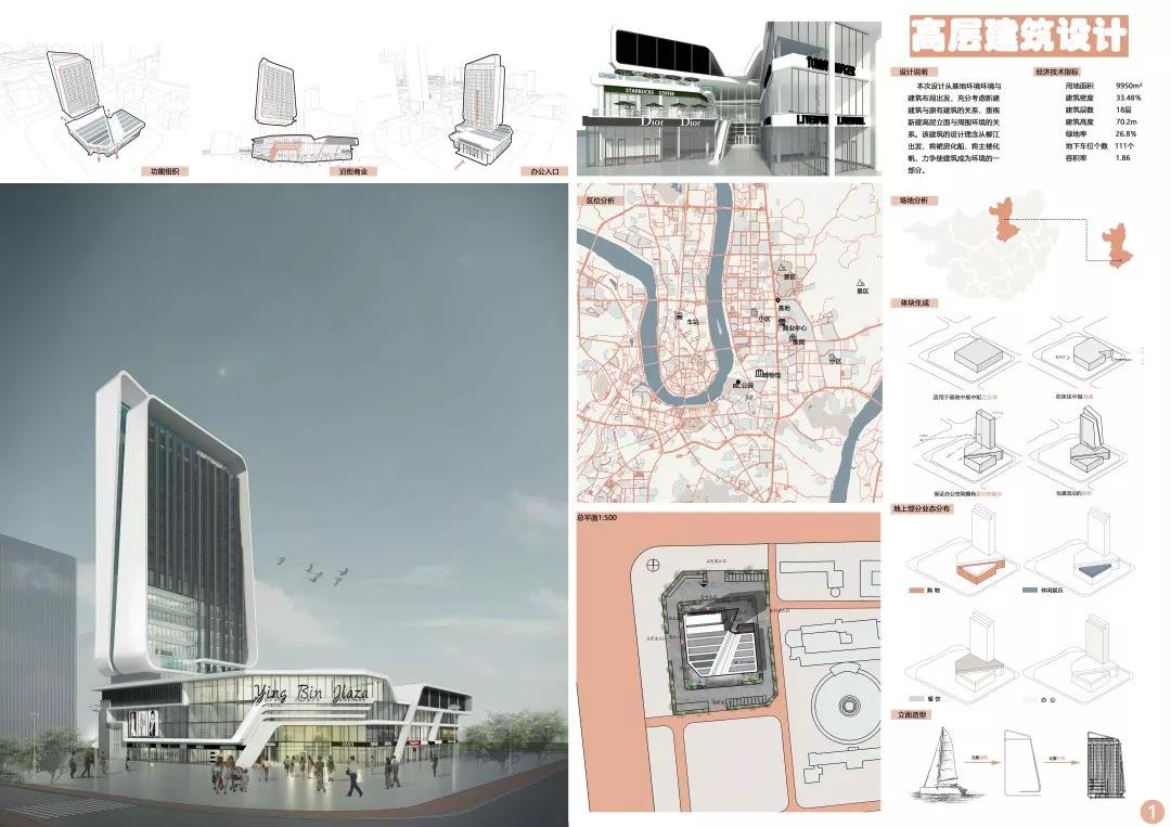 该建筑的设计理念从柳江出发,将裙房化船,将主楼化帆,从基地环境与建筑布局出发,考虑新建建筑与原有建筑的关系,重视新建高层立面与周围环境的关系,力争使建筑成为环境的一部分。