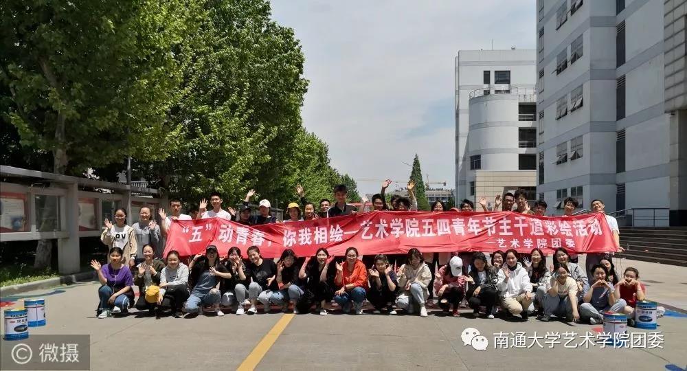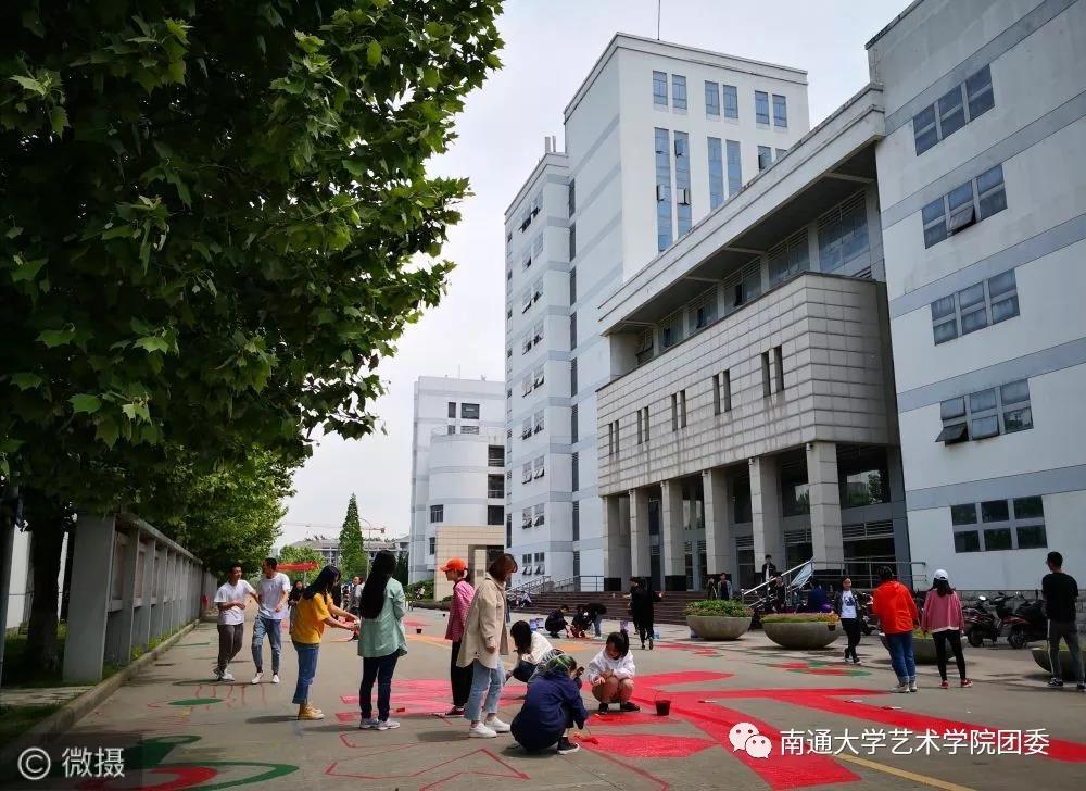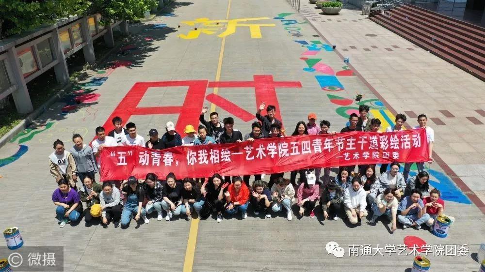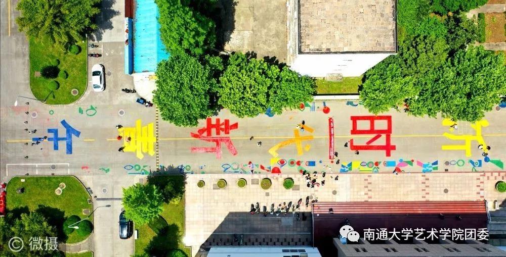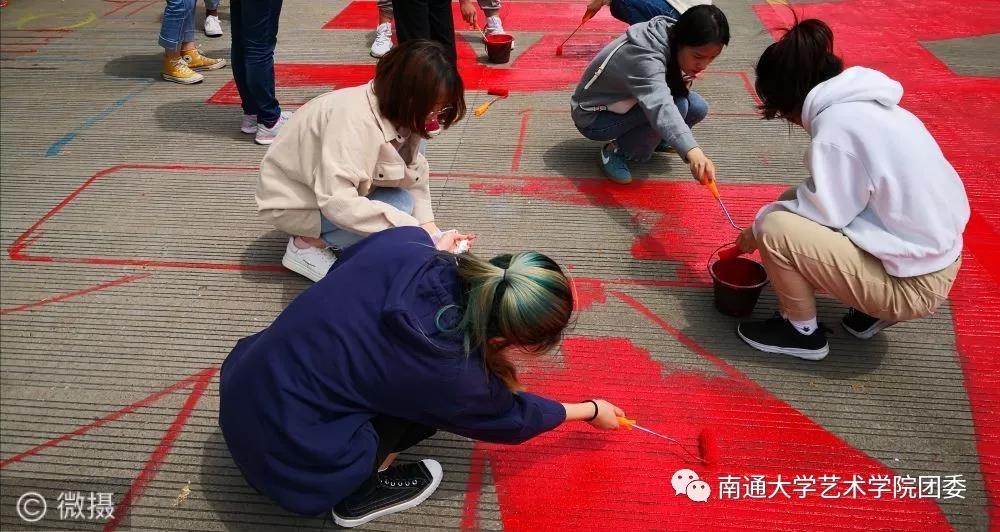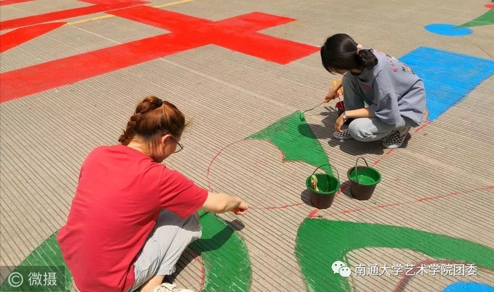 一个个五彩斑斓的图案,在南通大学钟秀校区主干道上闪耀着光芒。一个个自带颜料和工具的学生,穿梭在主干道的周围。同学们分工明确、调色、勾边、填涂有条不紊。半天下来,大家都是沾满五颜六色的颜料、各种汗渍和笑靥绽放的统一表情。