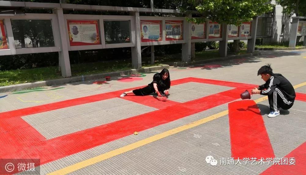 一个个五彩斑斓的图案,在南通大学钟秀校区主干道上闪耀着光芒。一个个自带颜料和工具的学生,穿梭在主干道的周围。同学们分工明确、调色、勾边、填涂有条不紊。半天下来,大家都是沾满五颜六色的颜料、各种汗渍和笑靥绽放的统一表情。