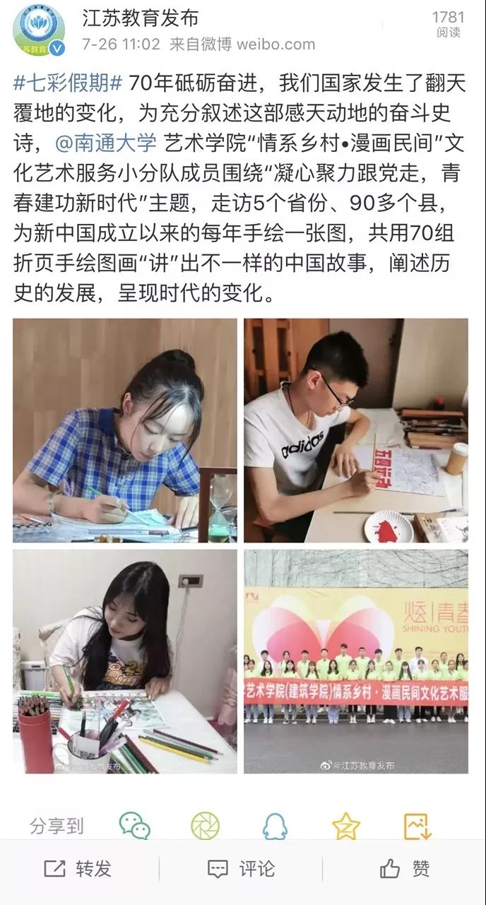 近日,江苏教育发布报道了南通大学艺术学院“情系乡村·漫画民间”文化艺术服务实践团以“凝心聚力跟党走,青春建功新时代”为主题,跨越江苏、黑龙江、山西等5个省份、90个地区开展的一场爱国情的传递。小分队成员以新中国成立以来的每年一张手绘图,共用70组折页手绘图画“讲”出不一样的中国故事,阐述历史的发展,呈现时代的变化。