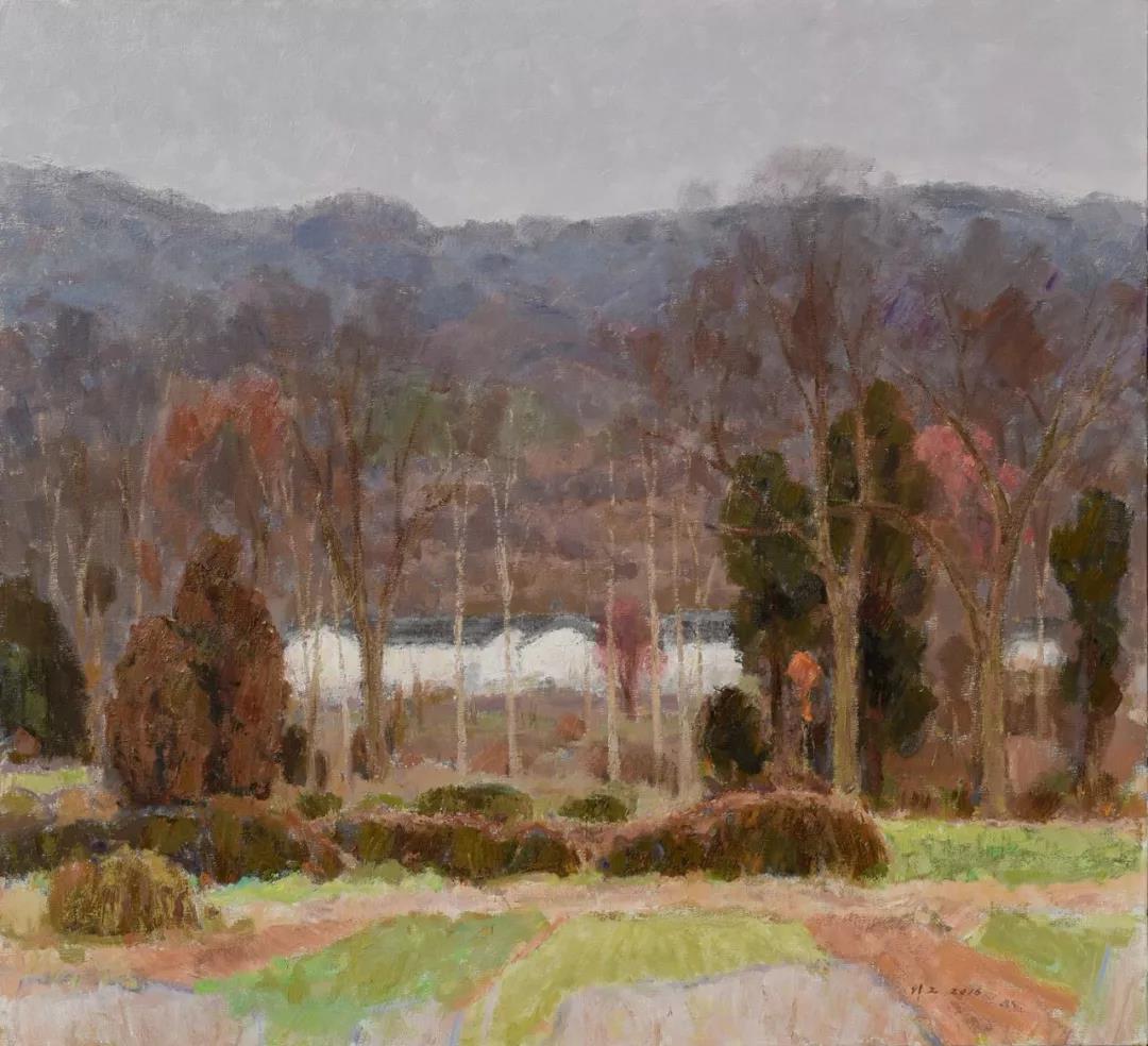 毫无疑问,沈行工的江南风景显示了当代中国油画在油画语言上对于本土文化性的探索。在他之前,还没有多少中国油画家能这样深入细微地表现阴天江南的色彩,还没有多少中国油画家能这样自如地运用色彩语言表达出江南的意蕴和情调,甚至还没有多少中国油画家能够在油画色彩语言和画面境界上表现出如此浓厚的书卷气。和中国文人画家一样,沈行工非常注重“画外功”的修身和陶练,他不只是画江南的色彩和景致,而是通过江南的色彩和景致传达他的文化情怀与格调。和他给人的儒雅印象一样,他的作品不仅呈现了江南的风景,而且传递了江南细腻委婉、温润典雅的气质与底蕴。因此,他的那些作品,在总体的审美取向上是秀丽、温和、平淡、萧散的,在洒脱而简远的境界中,弥散出淡泊的人生态度和平和的遁世情怀。这种审美取向与人格境界,也无不显示了林风眠、苏天赐对于他的深刻影响。他们共同追求的,是将中国文化的血脉和油画色彩语言的探索糅合一体所表达出的中国哲诗文化的审美情趣和审美意境。而沈行工在油画语言上的本土文化性的探索,无疑更加明晰了中国油画的价值取向与审美趣味。