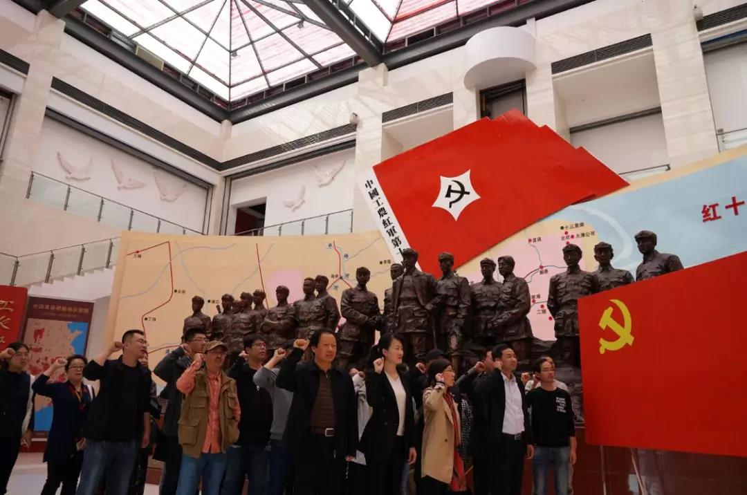 在红十四军纪念馆,院党委书记马列波带领大家面对鲜红的党旗,举起右手,重温入党誓词。