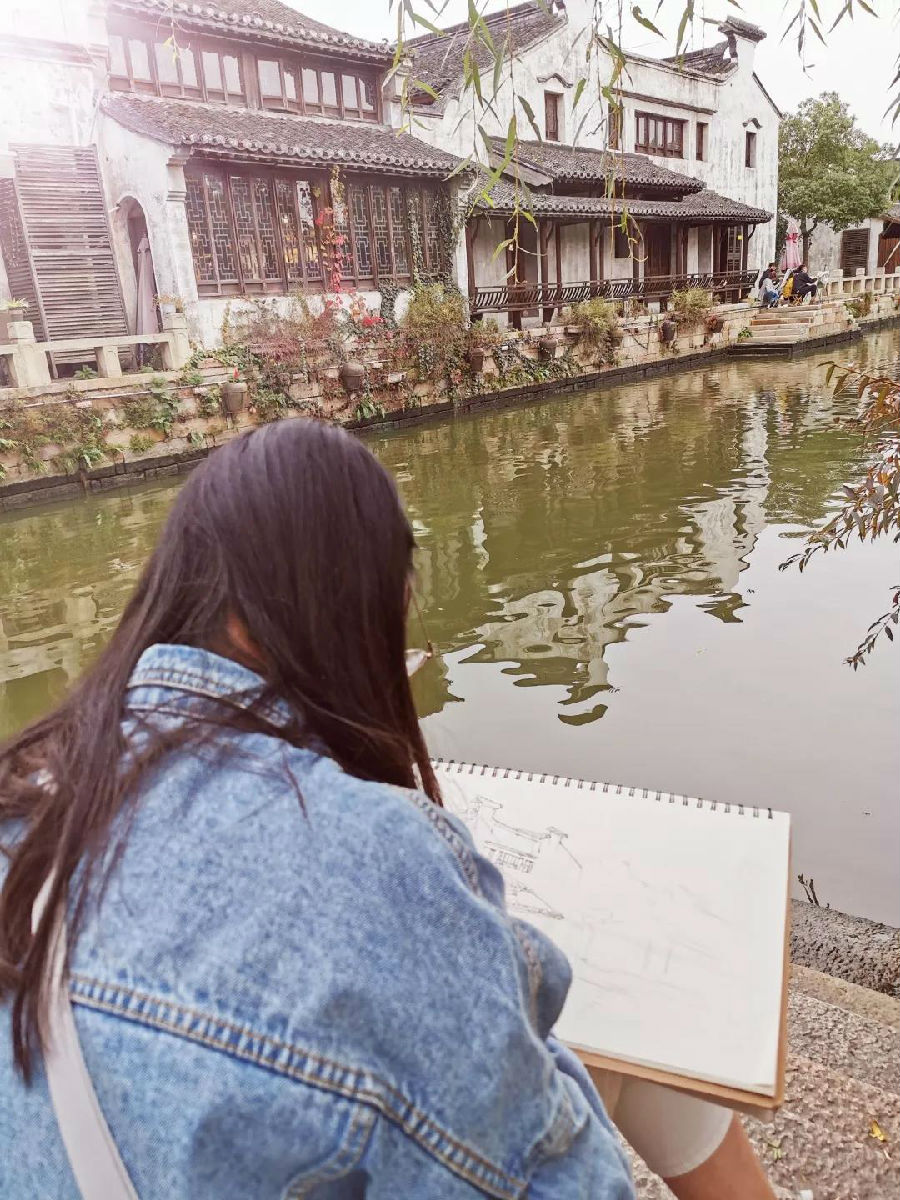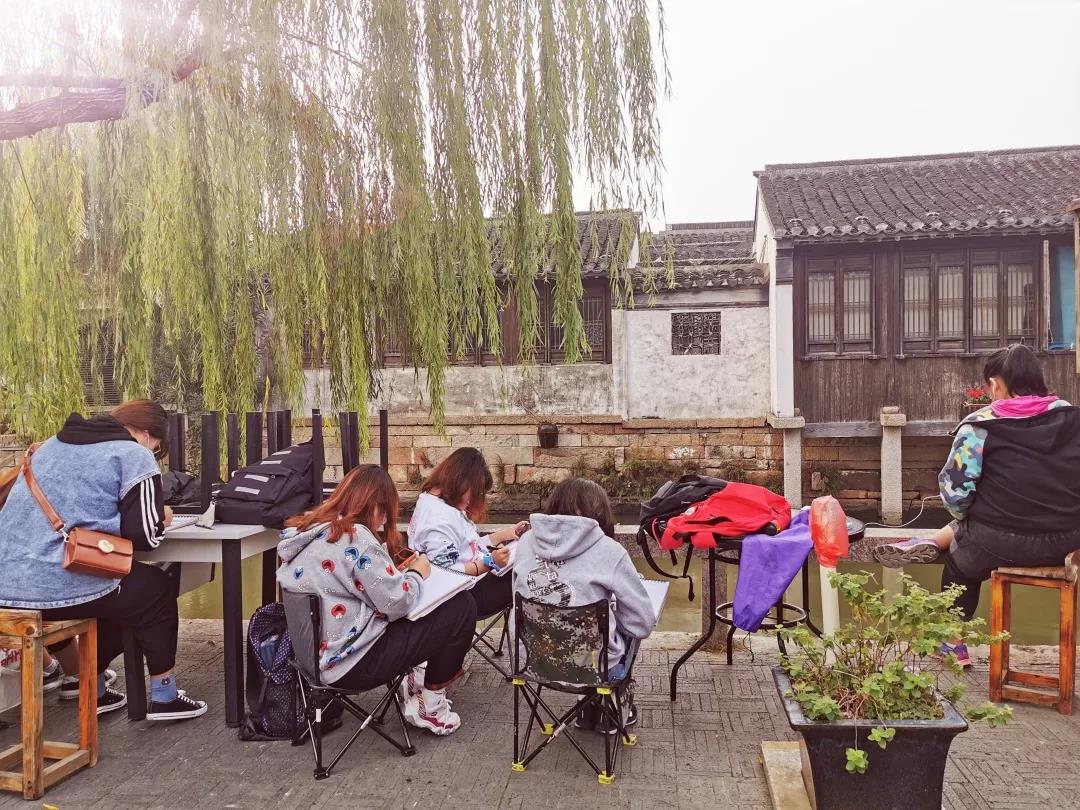 荡口古镇风景优美,河道纵横、湖荡密布,小桥流水、环境幽雅,特别符合艺术采风活动。同学们寻找各自心怡的角度,端起相机,拿起速写本,记录下美好的江南秋色。