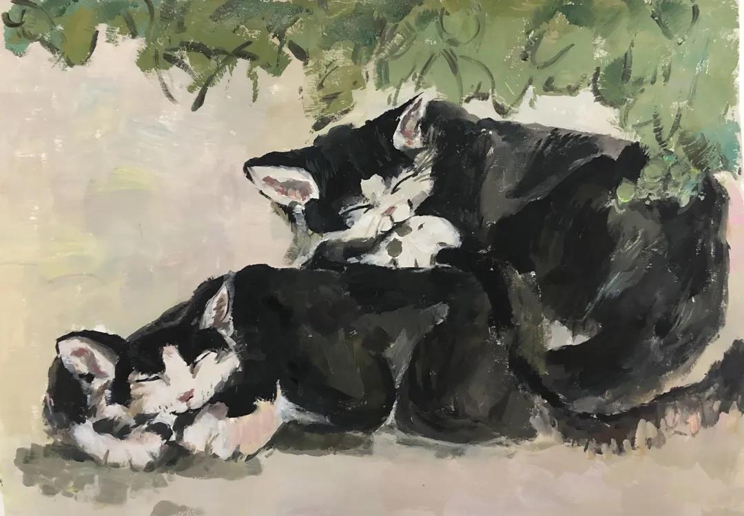 外面疫情逐渐好转,连带着一个多月没出门的我,心情也逐渐愉悦起来。带着愉悦的心情,在大好的午后拿起了画笔。无意瞥见家门口两只慵懒的小猫,在草丛下小憩,便用笔画下。高中的时候,美术被我当做考大学的捷径,直到大学,学习了国画油画后,才逐渐发现美术的奥妙。总听大人说画画有益陶冶情操,直到自己经历,才顿觉有道理。学习绘画,有利于提高我们的观察力、丰富个人生活、让人更自信、锻炼我们的耐心。同时,在绘画中,我们的想象力得到扩展和深化,经常绘画,也能让我们的身心健康能得到较好的发展。