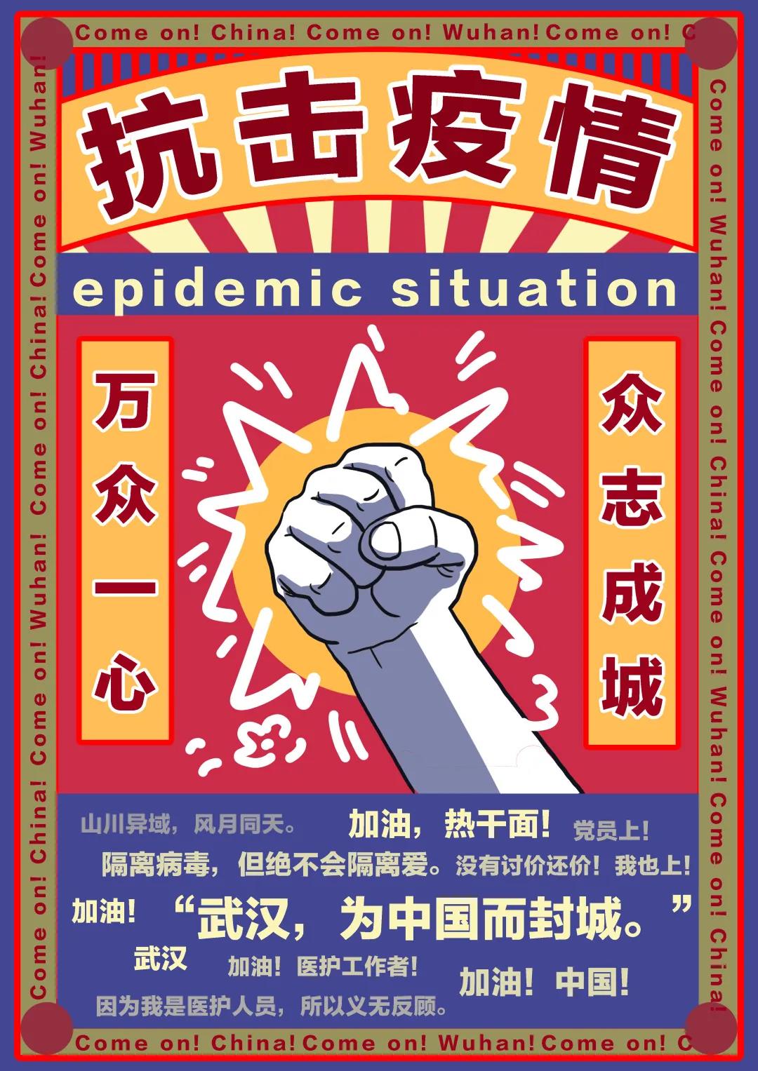 今年的春节假期和以往有了很大的不同,不能出门,出门必须带口罩,好像一切都被这场突如其来的疫情打乱了,虽然街道变得安静起来,但是人们内心并没有那么的平静,作为设计专业的同学纷纷在家里做起了海报为武汉加油,为中国加油。我们每个人通过不同的方式贡献出自己的一份微薄的力量,团结就是力量,我相信在大家的努力下,疫情一定会早日结束,期待战役结束的那一天!