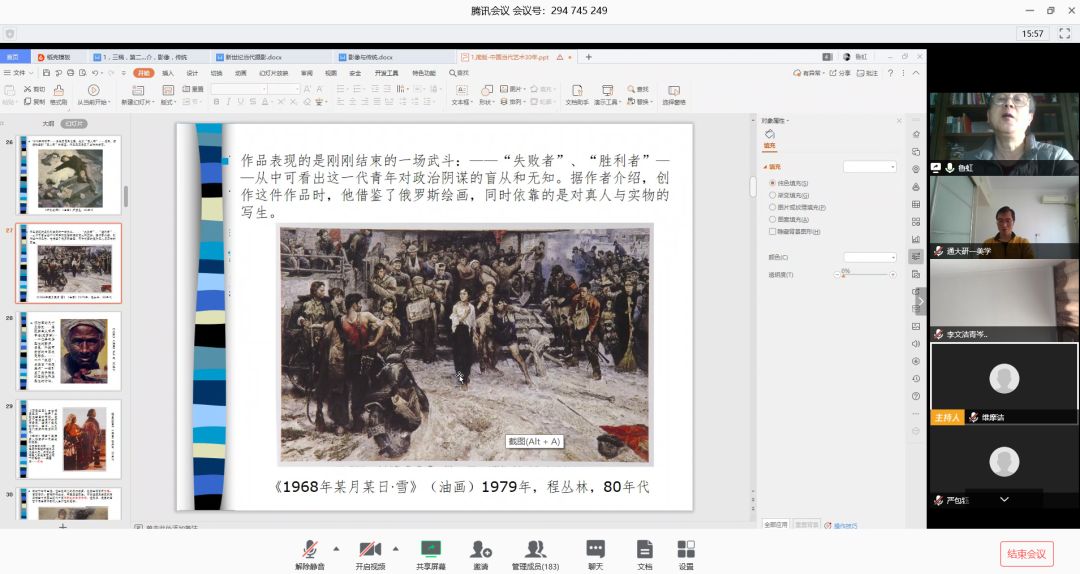 讲座过程中,鲁虹教授结合了时代背景、经济文化、国外理论影响等,列举了以罗中立、张晓刚、周春芽等为代表的一系列著名艺术家的创作实践作品,从成长到发展的过程出发,对他们的当代艺术创作进行了客观而清晰的解读。