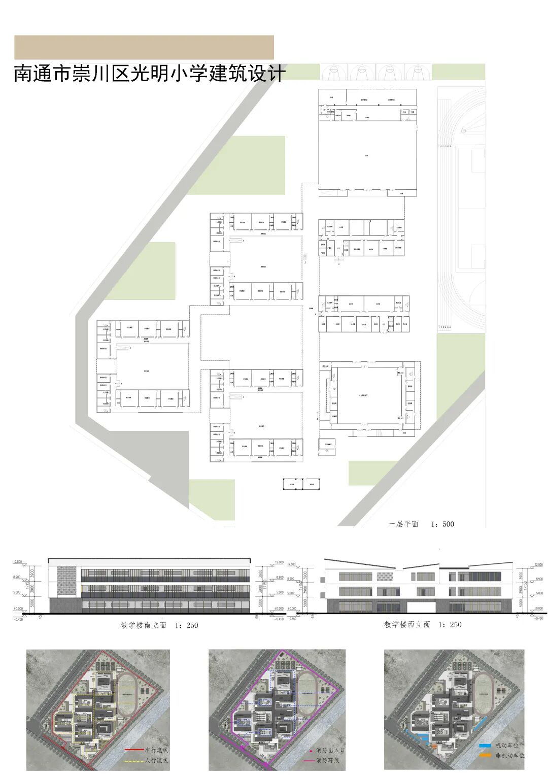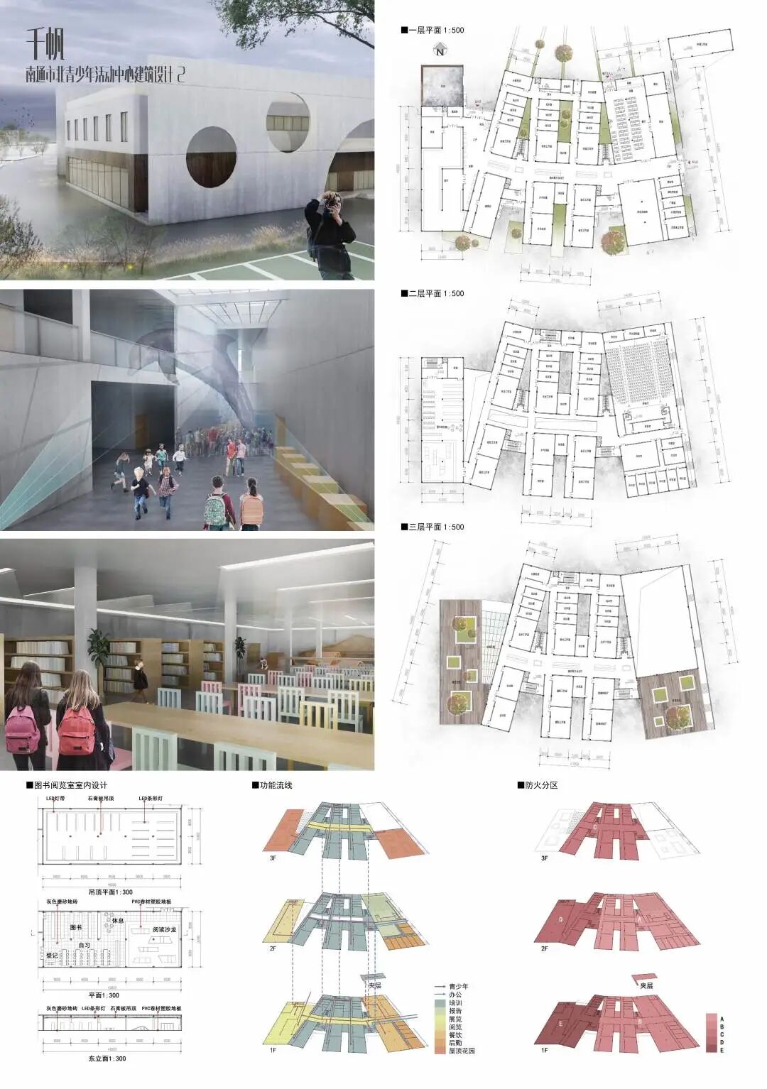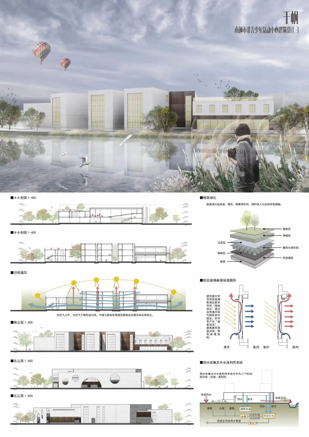 秦灶位于南通通吕运河北岸,素有南通北大门之称。本设计基于对南通市北秦灶盐运船舶文化的研究,并结合青少年成长特色,提出千帆的概念。由停泊在岸边的货船为出发点,运用象征手法转化为长方体和片墙形成序列,营造千帆过境的意境。建筑外部广场、运动场、滨河景观道、停车场围绕建筑主体呈环形布置,满足消防需求。建筑内部功能分区明确,培训主要分布于中间三个长方体体块中,展演、阅览、办公、餐饮分布于两侧,青少年和后勤人员流线清晰无干扰。建筑外墙以白色混凝土为主,营造粗犷干练的风格。建筑采用屋顶绿化、雨水收集及中水再利用系统等绿色技术达到节能减排。同时考虑无障碍设计,给予残疾人舒适与便捷。