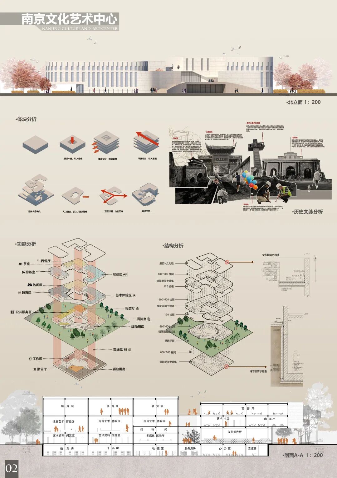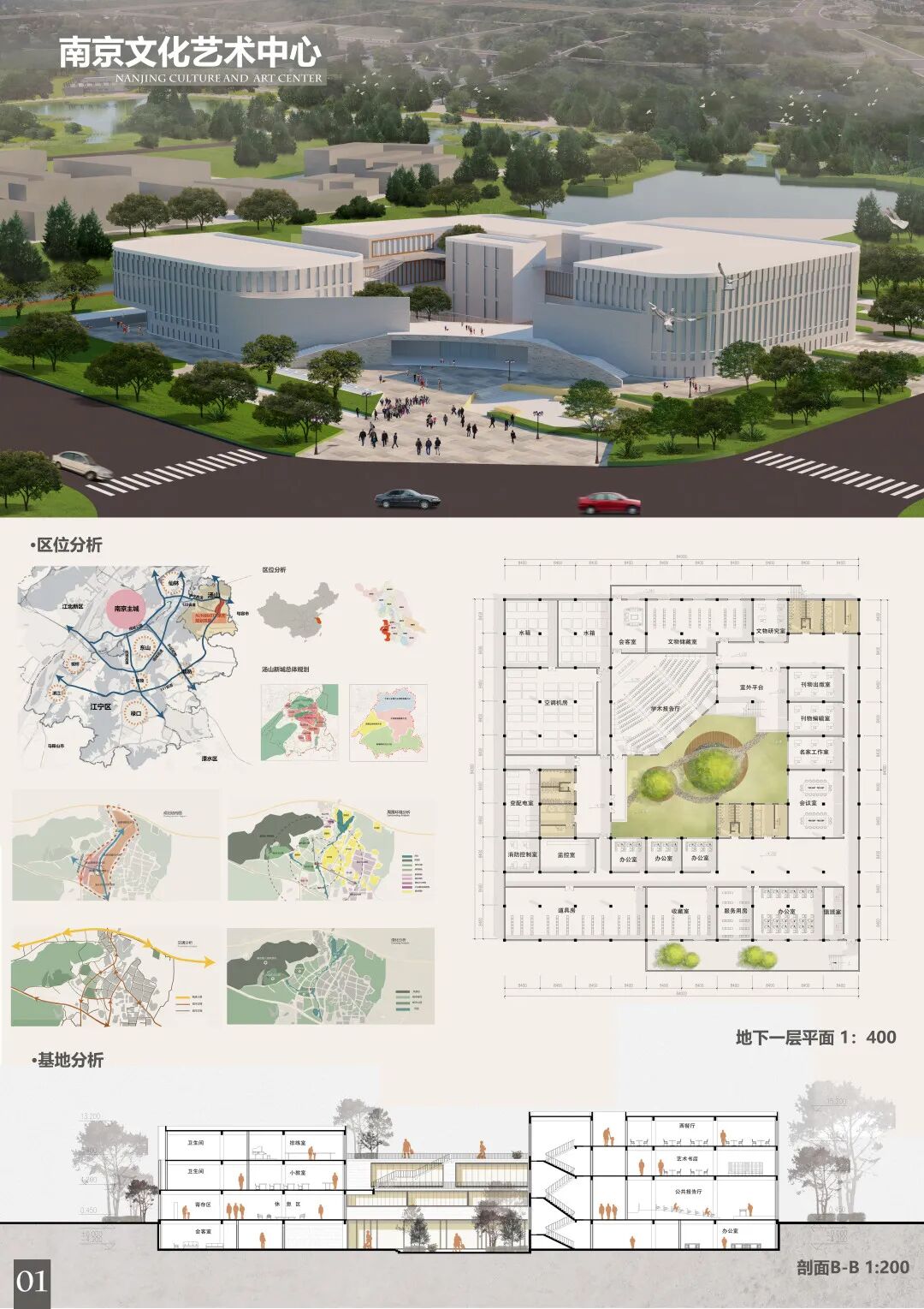 研究基地,设定中心轴线和动静分区。西侧距离交通道路较近,作为教学区,方便进出,减少交通距离;东侧作为活动区,主要为操场和运动场地;中间行政轴为办公、辅助教学、配套设施等功能。 选取白鹿洞书院的单元作为标准教学单元。选取四方形围合空间的形式,形成相对私密的空间,也适应小学生不同年龄段的不同活动能力的需求,将年龄相近的孩子相对集中,便于管理,防止其他事件的发生。 对标准教学单元进行复制,生成院落。三个教学单元,将低年级、中年级、高年级的学生相对分开,同时围合形成四个院落。让孩子们在日常学习生活中体验不同的中国文化。 用连廊衔接各个院落,形成丰富的空间。连廊不仅具备空间上的层次,更能让学生们在课间享受阳光和新鲜空气,避免长时间的室内学习。本建筑设计项目为了开发汤山新城,充分挖掘潜力,为当地经济注入活力,吸引游客,同时提升当地居民艺术文化修养,增加城市交流空间。建筑以“洄”为主题,可拆分为“水”、“环绕的围墙”,将南京最具盛名的明城墙和秦淮河抽象化,融合一体。同时考虑到对周围景观的吸收和利用,入口采用大楼梯直通二层且二层采用退台的形式。为了保证地下一层的行政办公有自然光照和通风,特别设立了中庭。整体建筑形态也有将南京的传统文化环抱传承之意。为了充分利用东边和南边的河道景观,在建筑的东南方向设置了广场和景观廊道与西北处的入口广场相呼应。二层以上为开敞式,增加了人的室外活动空间,创造了人们日常交往的场所。本项目旨在提供城市过渡空间,为当地居民的日常生活注入艺术活力,同时为外来游客展现南京地区文化特征,提供一个开放、自由、舒适的艺术交往平台。