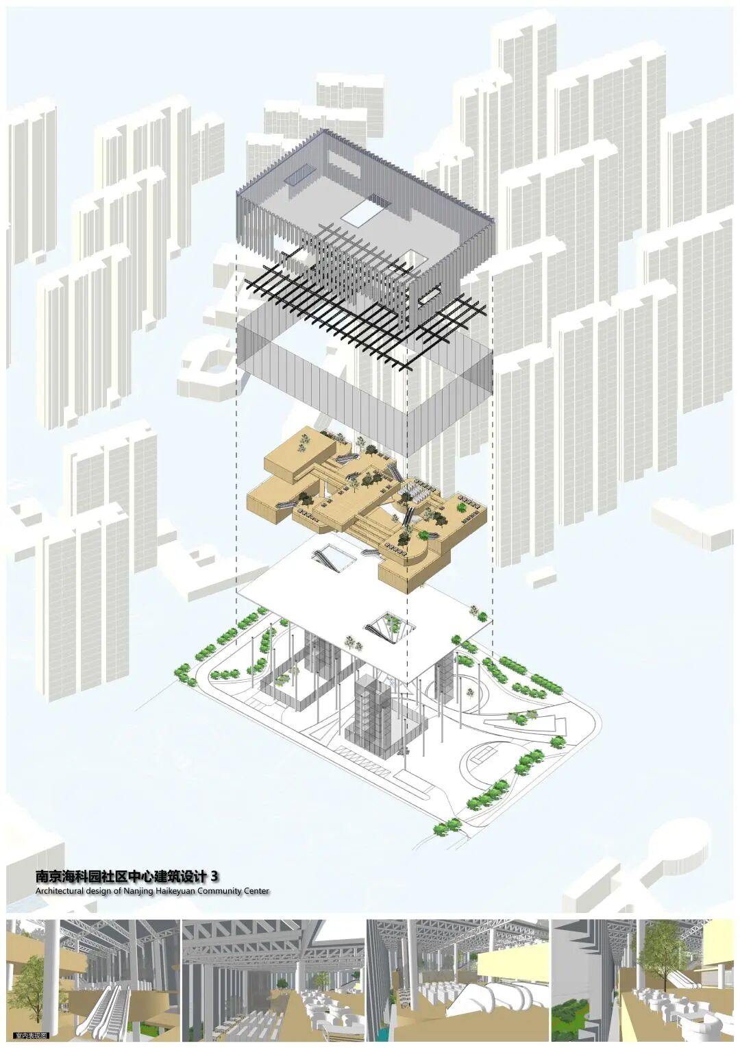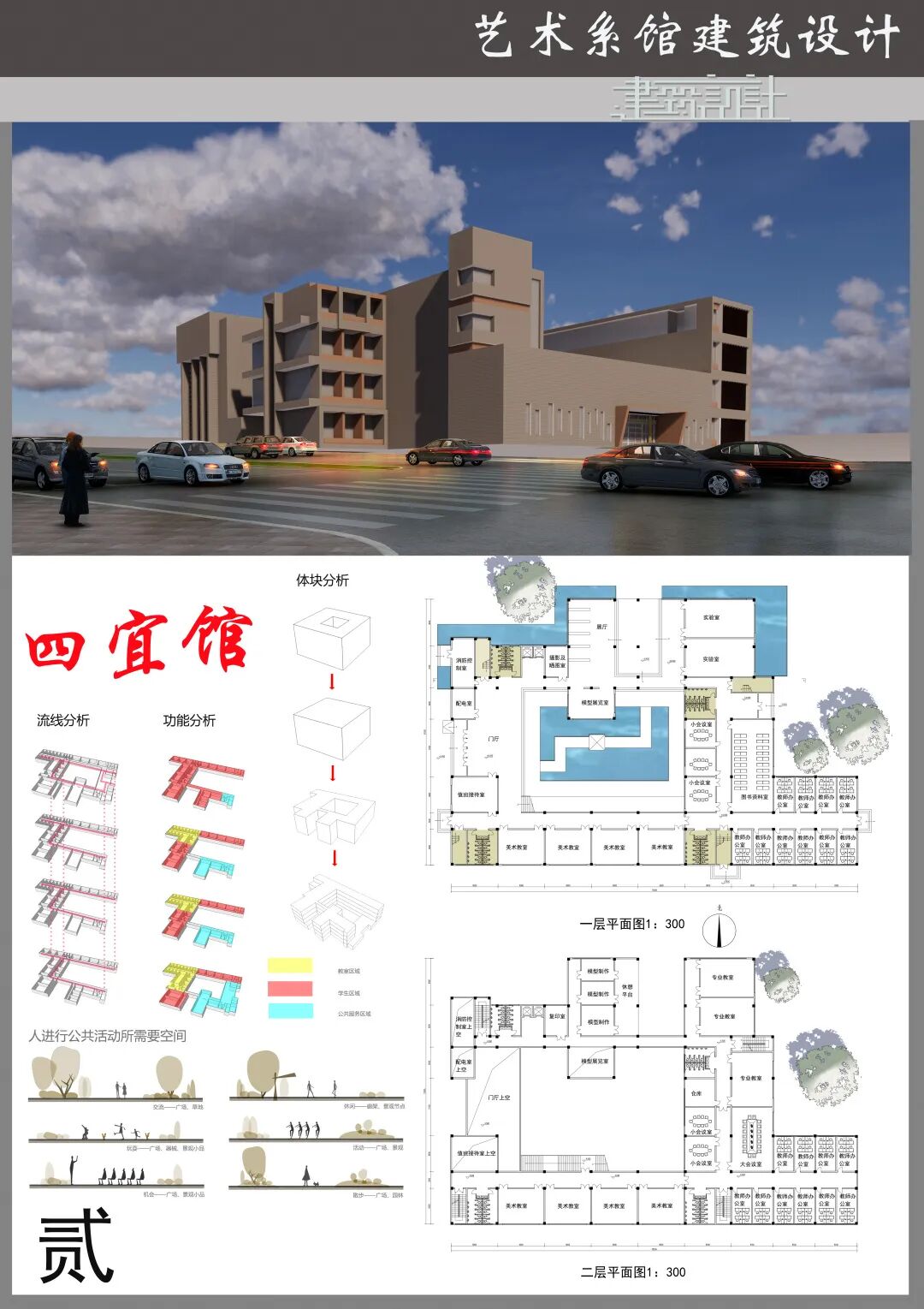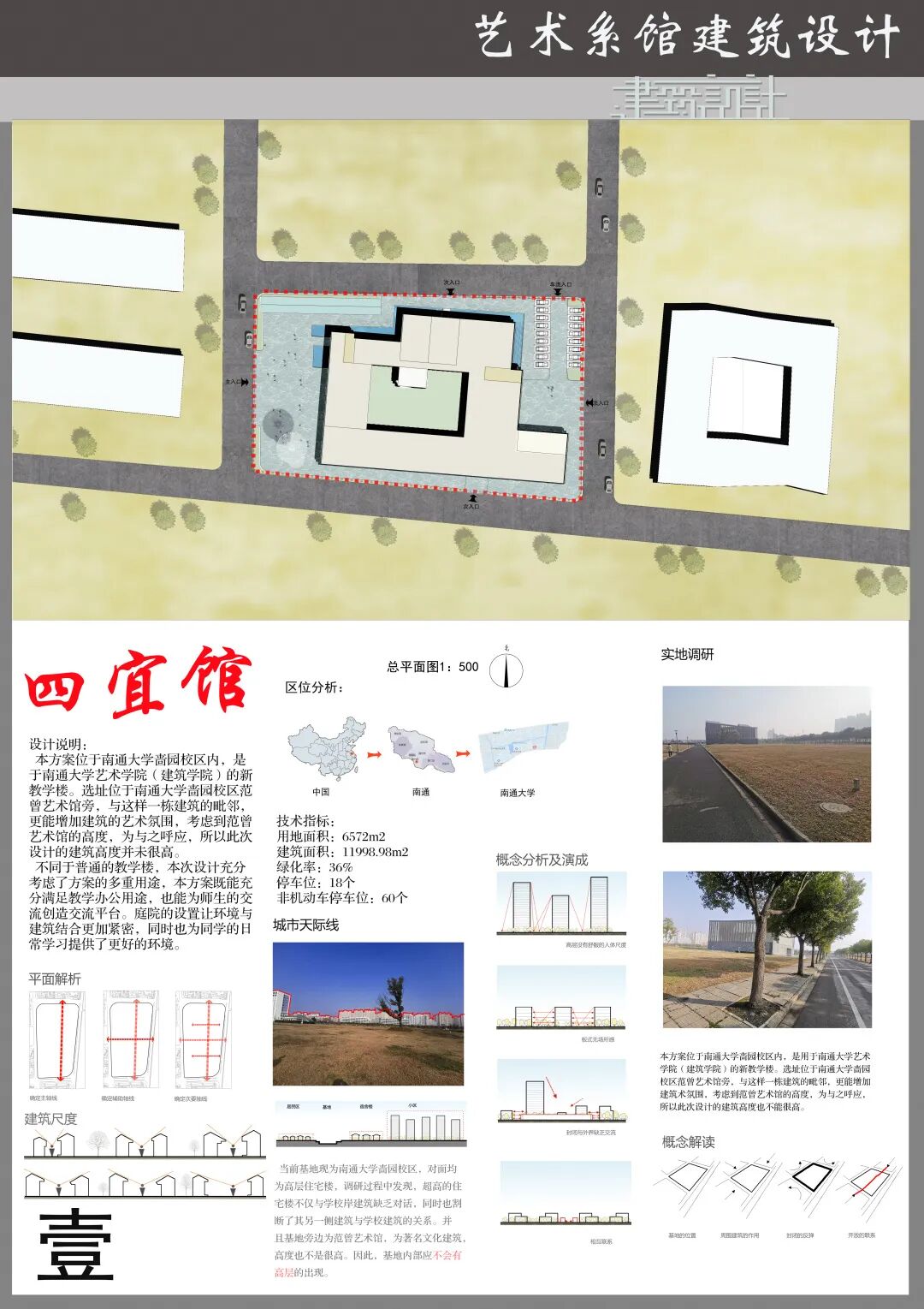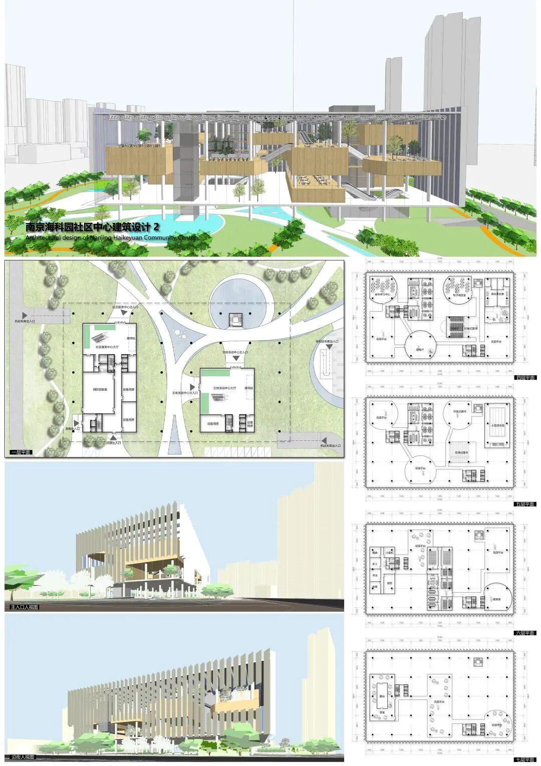 在人们的印象中,传统社区公共服务和社区商业大致就是几家烟杂店,理发店,水果店,零散的几家银行等,很显然,这样的观点已经不适合现代社区的需求。以底商为普遍形式的社区商业在功能设置上显得匮乏,也使得街景显得凌乱不堪,零散设置的社区公共服务设施也不利于居民使用,居民缴纳煤气,水,电费往往都需要几处奔波。本案中社区中心场地东侧紧邻社区公园,所以我不希望建筑的出现破坏了中心公园地区的绿色风景,更不希望妨碍公园内悠闲散步的居民,由此我产生了“将社区中心放在公园里,也将公园放在社区中心里”的想法,这也是本方案的设计主旨。于是在场地的设计中采用公园式绿地设计,置入丰富的绿植、水景、步道,与东侧公园融为一体,相互补充,此时将建筑以底层架空的形式置于场地中,建筑体块采用轻盈通透的外饰面材质,达到“将社区中心放在公园里”的目的。在建筑的设计中我将建筑的主要功能单独拎出,去除其余开放空间与交通辅助空间,做“减法”,留下各个功能“盒子”,将绿色置于“盒子”间,形成空中花园平台,达到“将公园放在社区中心里”的目的。本方案位于南通大学啬园校区内,是用于南通大学艺术学院(建筑学院)的新教学楼。选址位于南通大学啬园校区范曾艺术馆旁,与这样一栋建筑的毗邻,更能增加建筑的艺术氛围,考虑到范曾艺术馆的高度,为与之呼应,所以此次设计的建筑高度并未很高。不同于普通的教学楼,本次设计充分考虑了方案的多重用途,本方案既能充分满足教学办公用途,也能为师生的交流创造交流平台。庭院的设置让环境与建筑结合更加紧密,同时也为同学的日常学习提供了更好的环境。 周庄游客服务中心作为文化艺术建筑,是对周庄景区功能的有益提升和重要补充,从建筑功能上与周边街道相协调。此外,作为周庄景区的重要组成部分,“旅游服务中心”的建设也更有利于塑造展示了周庄景区的形象,继续以江南水乡之最的姿态走向世界。建筑主体采用长方形拼接,既能满足功能造型的要求,又可以与城市肌理融为一体,不觉突兀。采用基本的建筑设计方法,希望能够使建筑与自然和谐统一,展现古镇自有的风貌,与风景区相互衬托。立面方向性强,整体建筑呈现半开放的状态,新的游客服务中心需要将建筑与自然相结合,打破原先的沉闷景象,使人耳目一新。