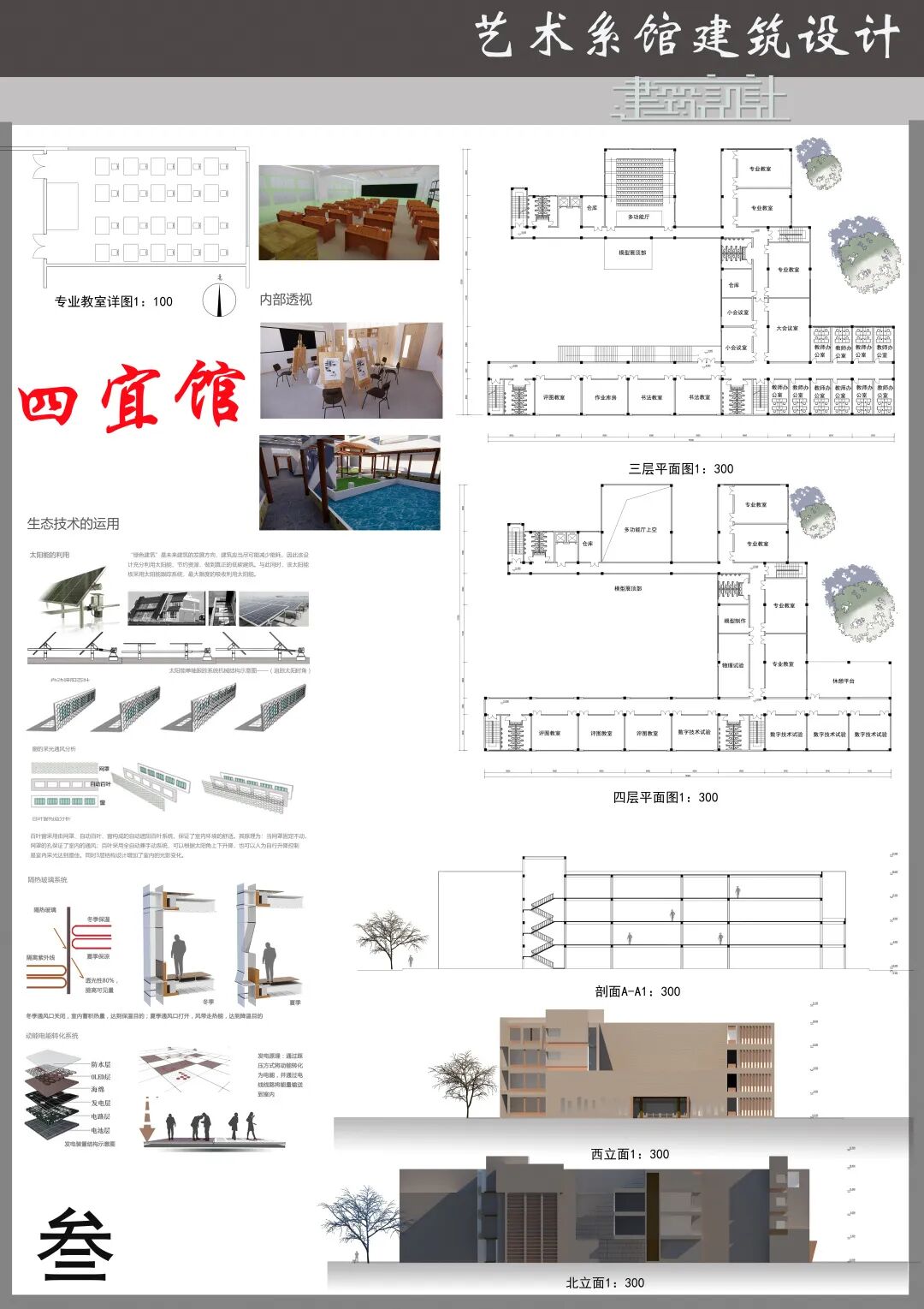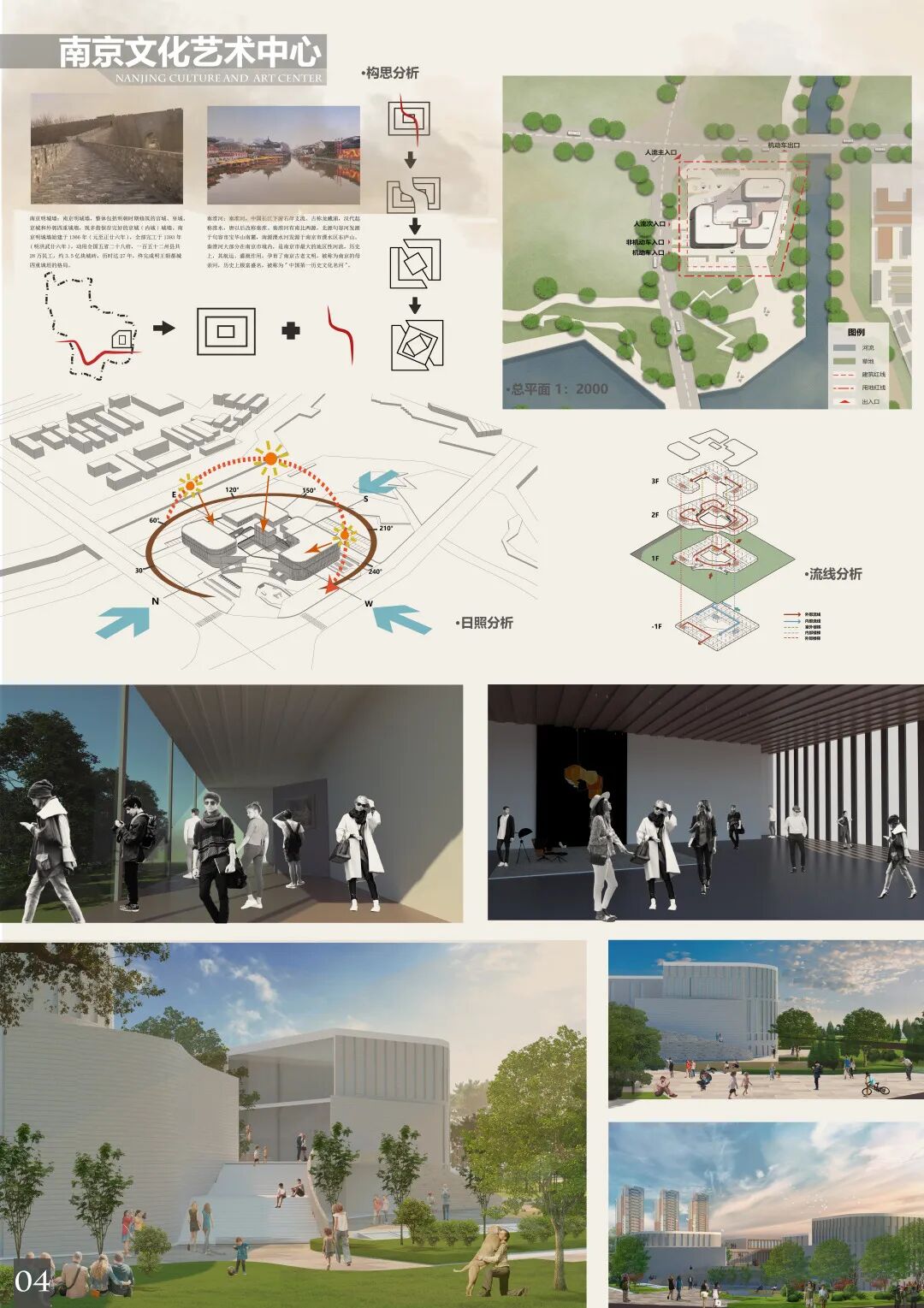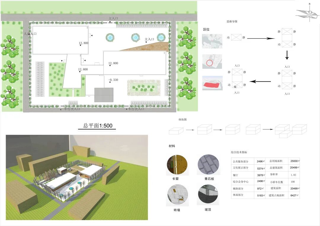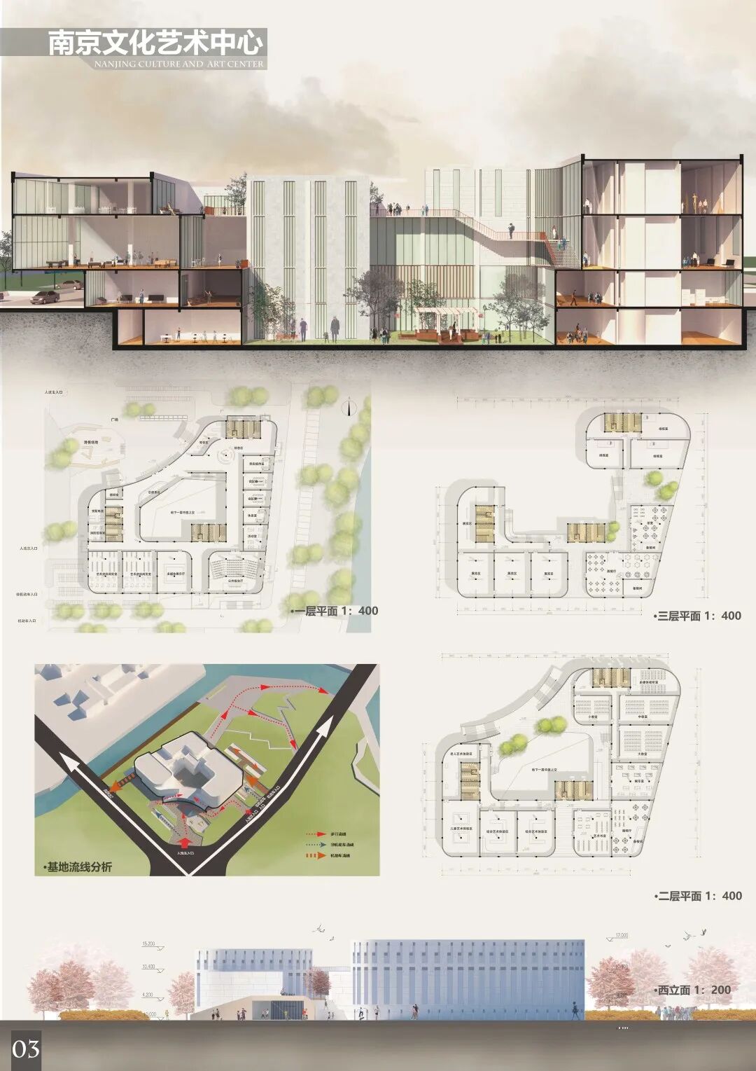 在人们的印象中,传统社区公共服务和社区商业大致就是几家烟杂店,理发店,水果店,零散的几家银行等,很显然,这样的观点已经不适合现代社区的需求。以底商为普遍形式的社区商业在功能设置上显得匮乏,也使得街景显得凌乱不堪,零散设置的社区公共服务设施也不利于居民使用,居民缴纳煤气,水,电费往往都需要几处奔波。本案中社区中心场地东侧紧邻社区公园,所以我不希望建筑的出现破坏了中心公园地区的绿色风景,更不希望妨碍公园内悠闲散步的居民,由此我产生了“将社区中心放在公园里,也将公园放在社区中心里”的想法,这也是本方案的设计主旨。于是在场地的设计中采用公园式绿地设计,置入丰富的绿植、水景、步道,与东侧公园融为一体,相互补充,此时将建筑以底层架空的形式置于场地中,建筑体块采用轻盈通透的外饰面材质,达到“将社区中心放在公园里”的目的。在建筑的设计中我将建筑的主要功能单独拎出,去除其余开放空间与交通辅助空间,做“减法”,留下各个功能“盒子”,将绿色置于“盒子”间,形成空中花园平台,达到“将公园放在社区中心里”的目的。本方案位于南通大学啬园校区内,是用于南通大学艺术学院(建筑学院)的新教学楼。选址位于南通大学啬园校区范曾艺术馆旁,与这样一栋建筑的毗邻,更能增加建筑的艺术氛围,考虑到范曾艺术馆的高度,为与之呼应,所以此次设计的建筑高度并未很高。不同于普通的教学楼,本次设计充分考虑了方案的多重用途,本方案既能充分满足教学办公用途,也能为师生的交流创造交流平台。庭院的设置让环境与建筑结合更加紧密,同时也为同学的日常学习提供了更好的环境。 周庄游客服务中心作为文化艺术建筑,是对周庄景区功能的有益提升和重要补充,从建筑功能上与周边街道相协调。此外,作为周庄景区的重要组成部分,“旅游服务中心”的建设也更有利于塑造展示了周庄景区的形象,继续以江南水乡之最的姿态走向世界。建筑主体采用长方形拼接,既能满足功能造型的要求,又可以与城市肌理融为一体,不觉突兀。采用基本的建筑设计方法,希望能够使建筑与自然和谐统一,展现古镇自有的风貌,与风景区相互衬托。立面方向性强,整体建筑呈现半开放的状态,新的游客服务中心需要将建筑与自然相结合,打破原先的沉闷景象,使人耳目一新。