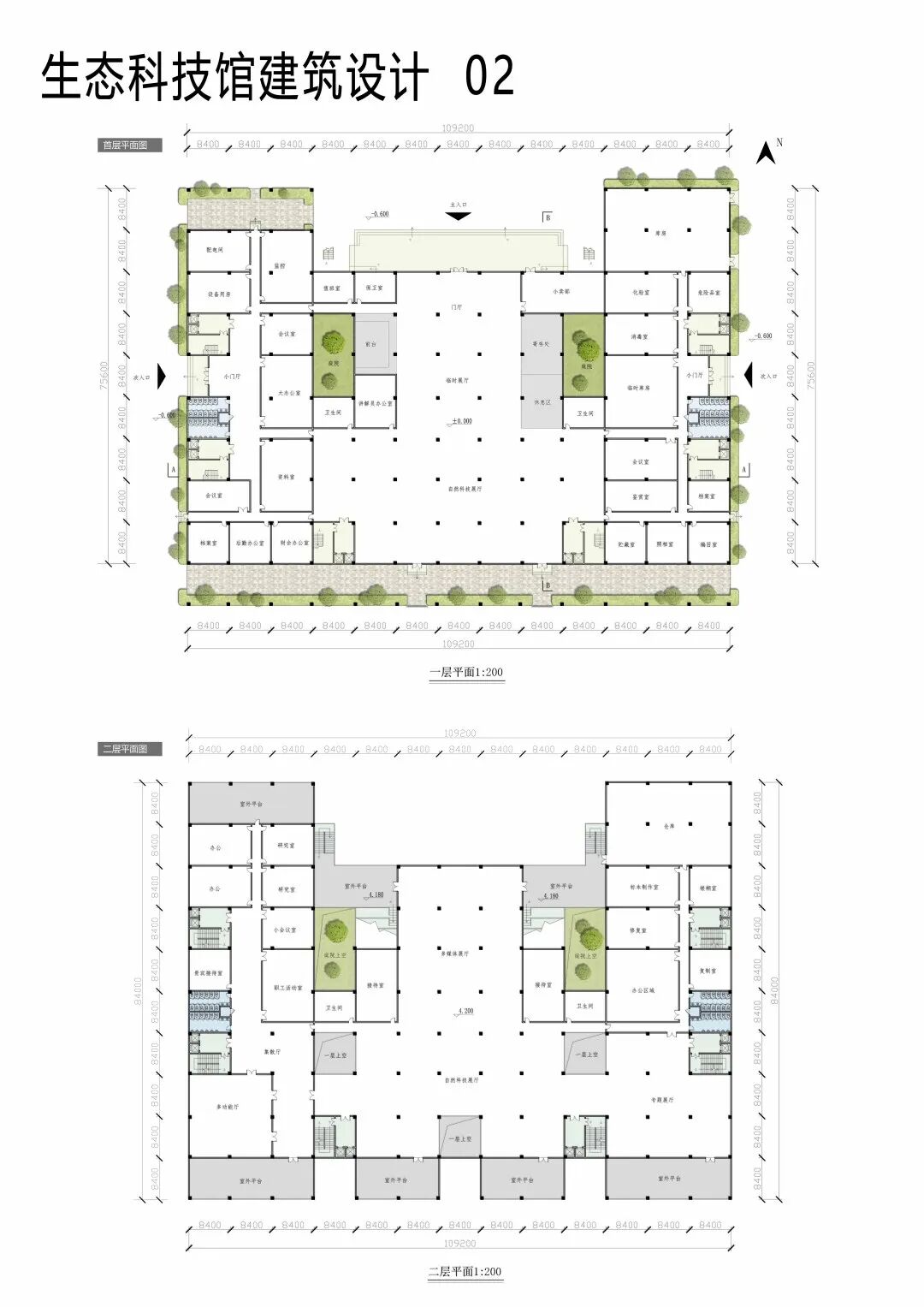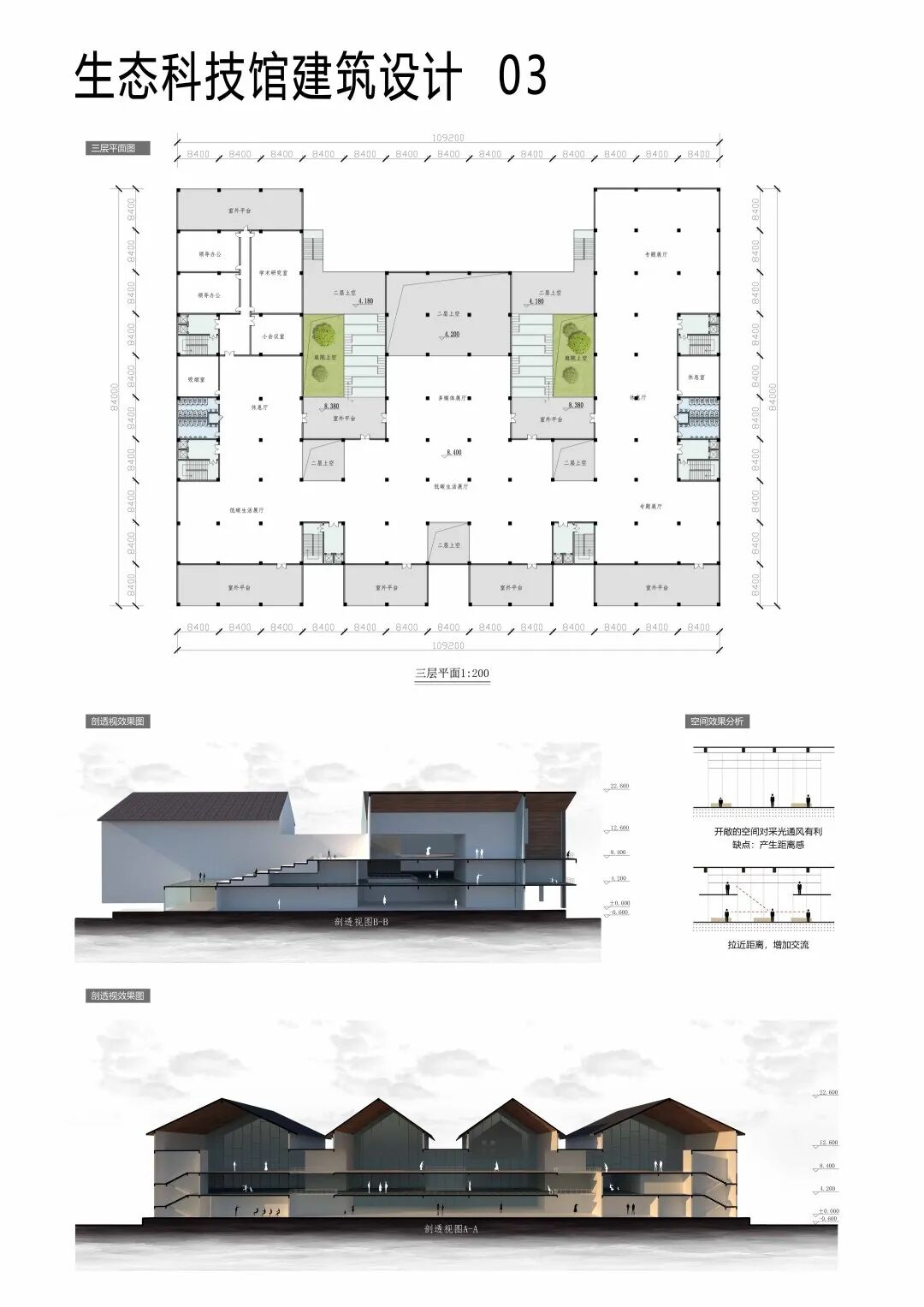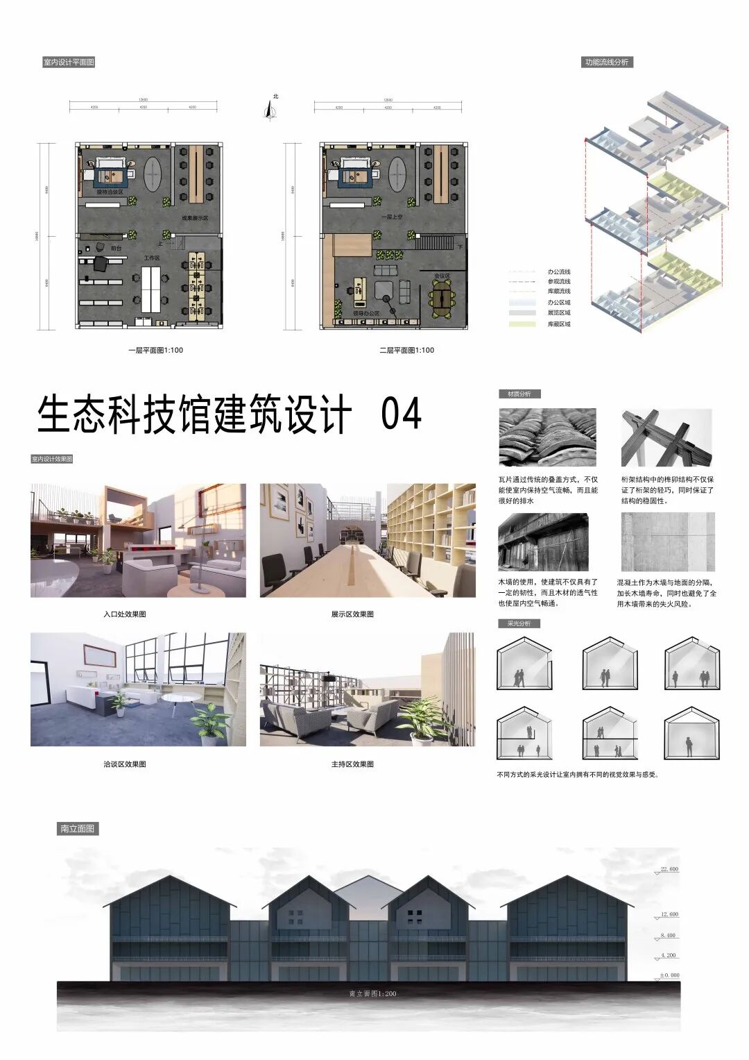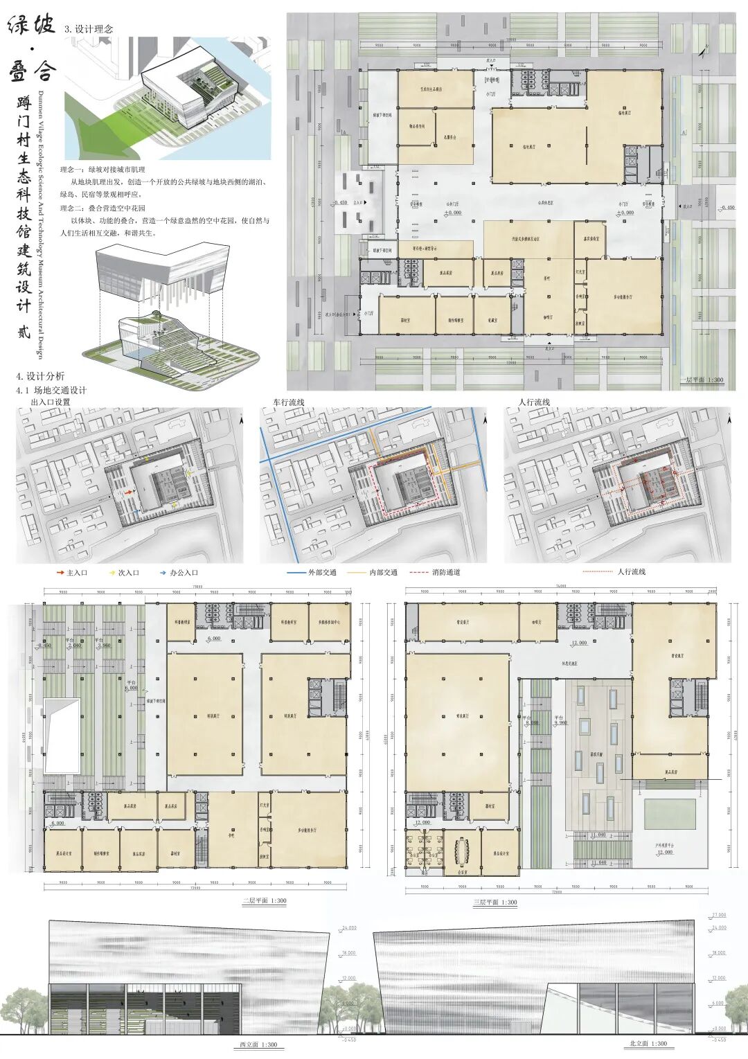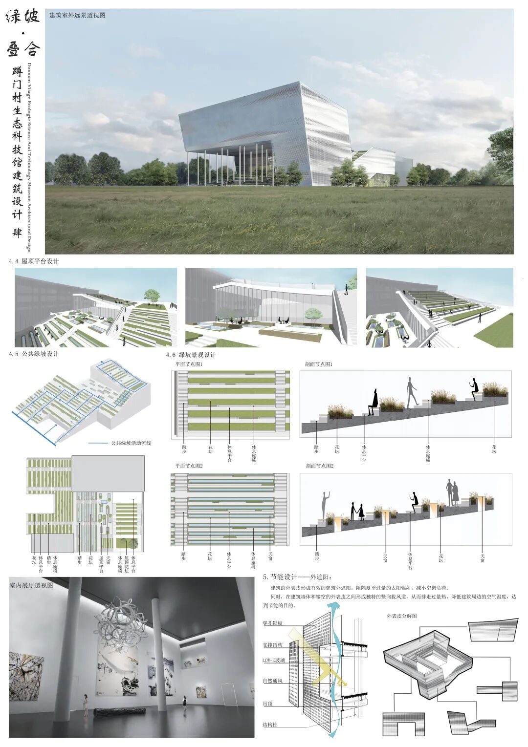 蹲门村生态科技馆建筑设计本着科普大众、面向未来的基本原则,充分考虑与项目用地周边的生态环境相融合的一致性。建筑布置也不再是简单的解决功能分区和流线组织,更需要去提高科普宣传的效应,创造氛围浓厚的科技环境。因此此次设计将建筑体块进行部分挖去和架起,同时结合开放的公共绿坡,共同营造一种绿意盎然、生机勃勃的生态建筑氛围。随着绿坡的台阶往上走,即可到达不同高度的休息观景平台,不仅丰富观赏者的游玩体验,也在视觉上创造一种螺旋上升的动感趋势,整个科技馆的功能区也由下而上的从开放的展厅过渡到较为私密的工作室等场所,实现环境与功能的统一。