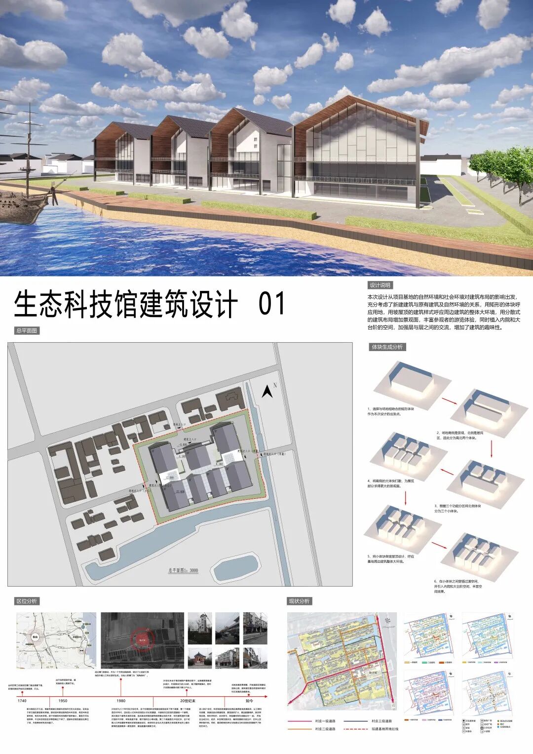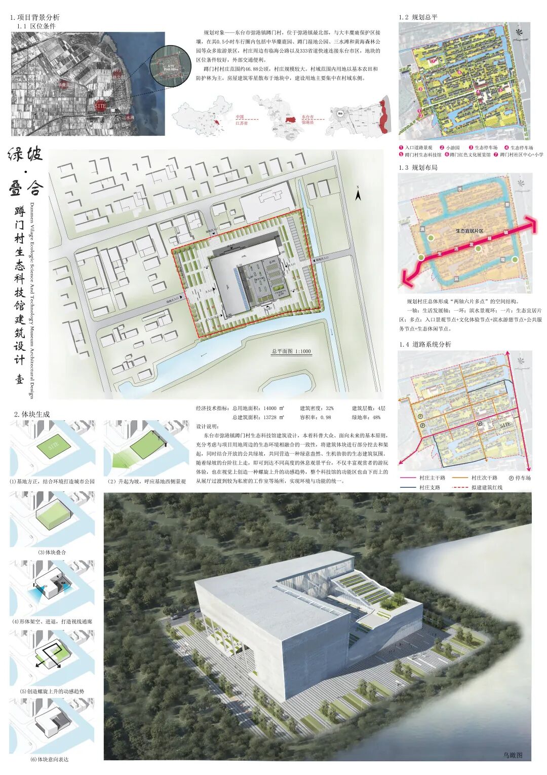 为了响应国家建设美丽新农村和普及科学技术知识的号召,充分利用蹲门村湿地资源丰富的自然条件,丰富村民的文化生活,在蹲门村新建生态科技馆,旨在帮助村子系统保护原有湿地文化的同时,充分发挥湿地资源的利用价值发展旅游观光产业,深入挖掘湿地文化。新建的生态科技馆建筑形体采用传统的坡屋顶,打破了以往科技馆新颖的建筑形态,努力把先生态文化理念和先进的科学技术融入乡村发展之中,增强人们对于保护湿地的意识,丰富人们的科学文化知识,传播新世纪发展过程中产生的新思想,并为蹲门村的文化发展和经济发展带来新的活力。