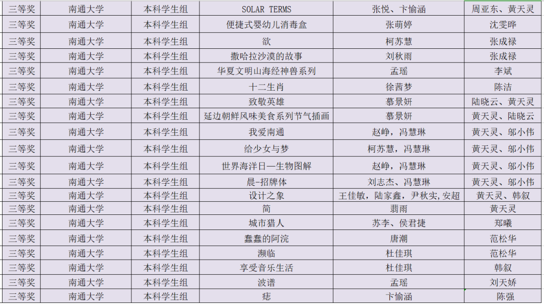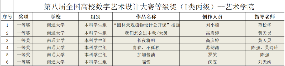 9月28日,第八届全国高校数字艺术设计大赛组委会公布了比赛结果,艺术学院学生组共获一等奖6个,二等奖9个,三等奖20个。教师组获二等奖1个,南通大学在竞赛组织活动中获得“卓越贡献奖”。