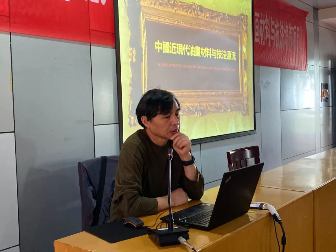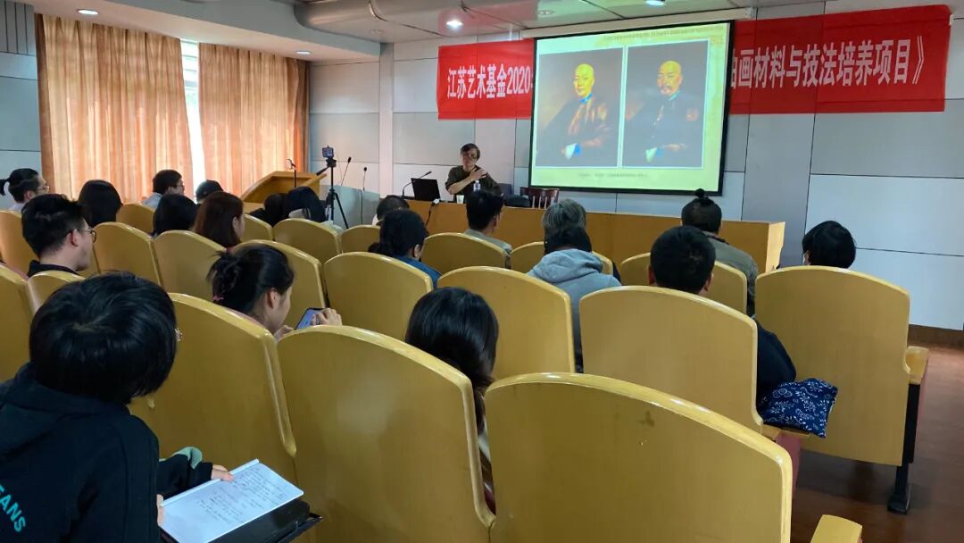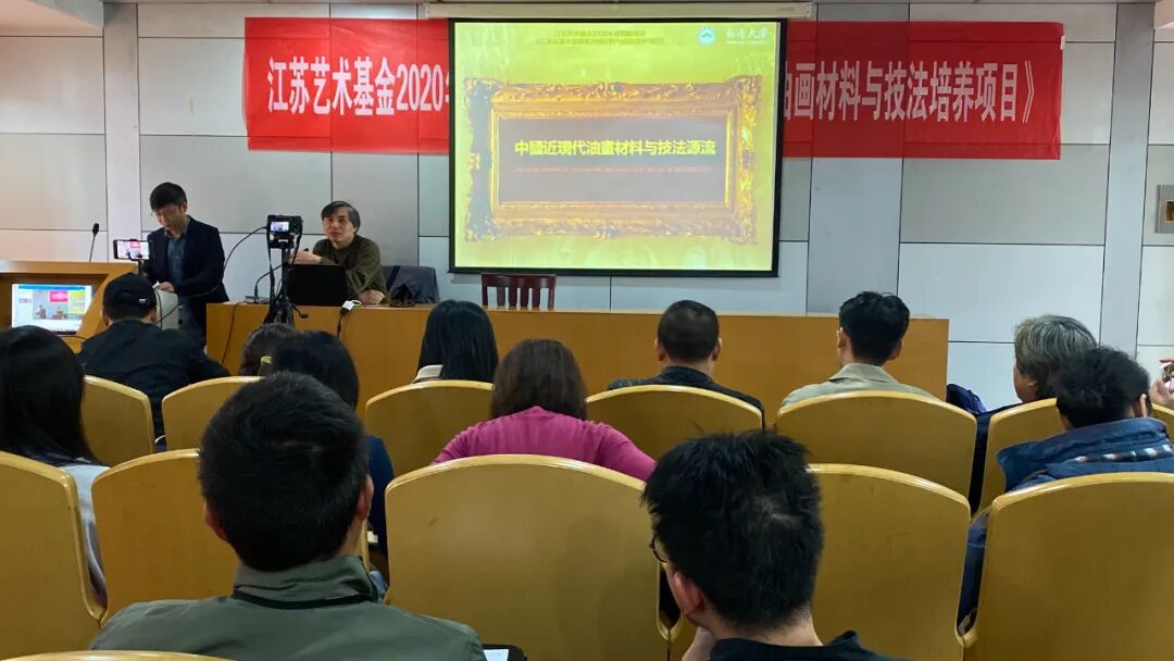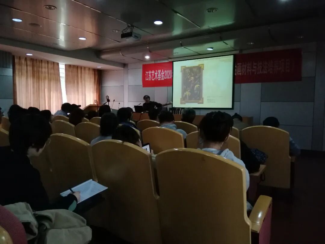 2020年10月18日,上海视觉艺术学院姚尔畅教授来到南通大学艺术学院,给江苏艺术基金2020年度“江苏省青年油画家油画材料与技法培养项目”学员讲课。上午9:00开始,姚尔畅教授以讲座的形式阐述中国近现代油画材料技法源流,讲座伊始,姚教授以大卫霍克尼的Great Wall为引子展开课程,阐述早期画家如何从技术手段还原写实绘画、为大家介绍了西方油画材料与技法的演变过程、西画东渐与油画材料技法在中国的早期传播方式及过程、以及现代中国材料技法与技法研究与发展,姚教授以诸多丰富的画作举例梳理出从法国巴黎美院到中国近现代油画家之间的师承脉络。