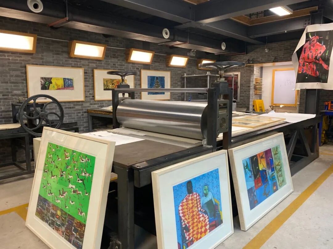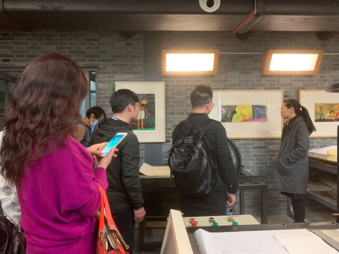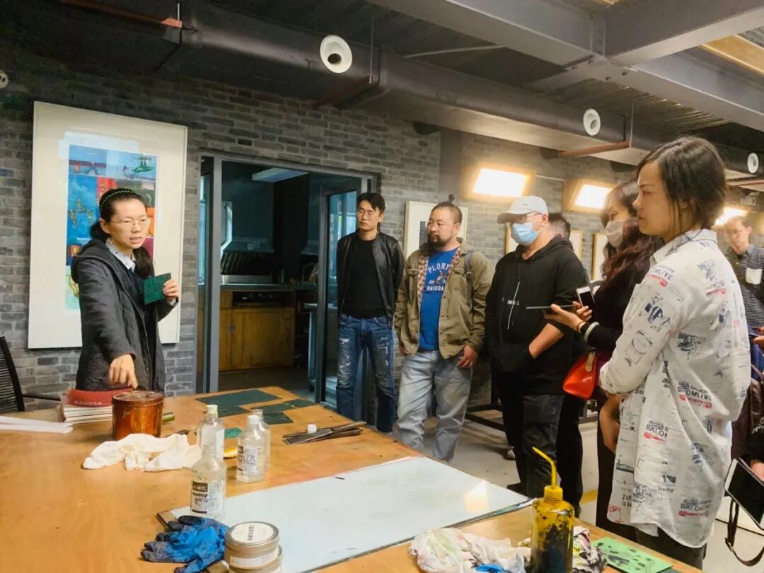 向园老师为学员们详细的介绍了版画的历史源流,以及版画的制作工艺、用具与过程。讲解了木刻版画、铜版画、丝网版画等工艺制作产生效果的区别,分享了工作室部分作品的制作方法。版画是视觉艺术的一个重要门类。广义的版画可以包括在印刷工业化以前所印制的图形普遍具有版画性质。青年油画家们所熟知西方绘画大师伦勃朗、丟勒、毕加索、安迪沃霍等都制作有大量的版画作品。学员们在参观过程中积极与向园老师互动提问,表示日后会做一些版画的尝试,拓展自己对传统绘画技法语言的研究。
